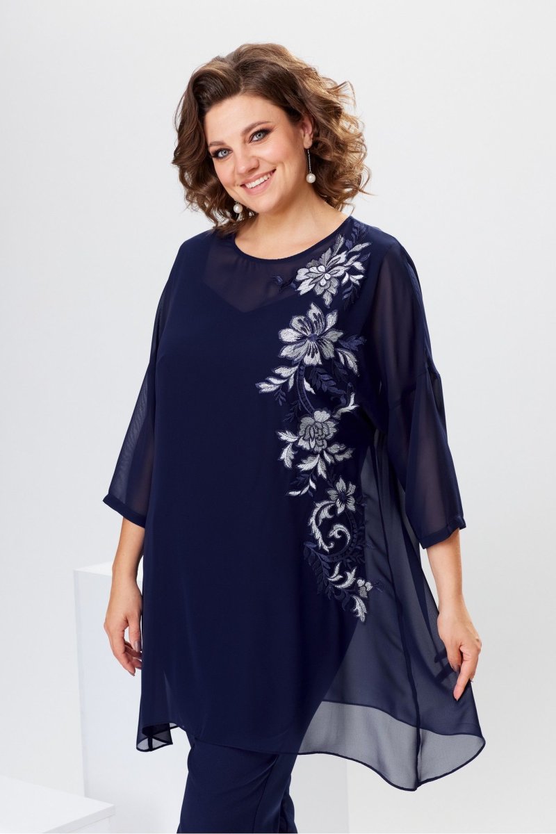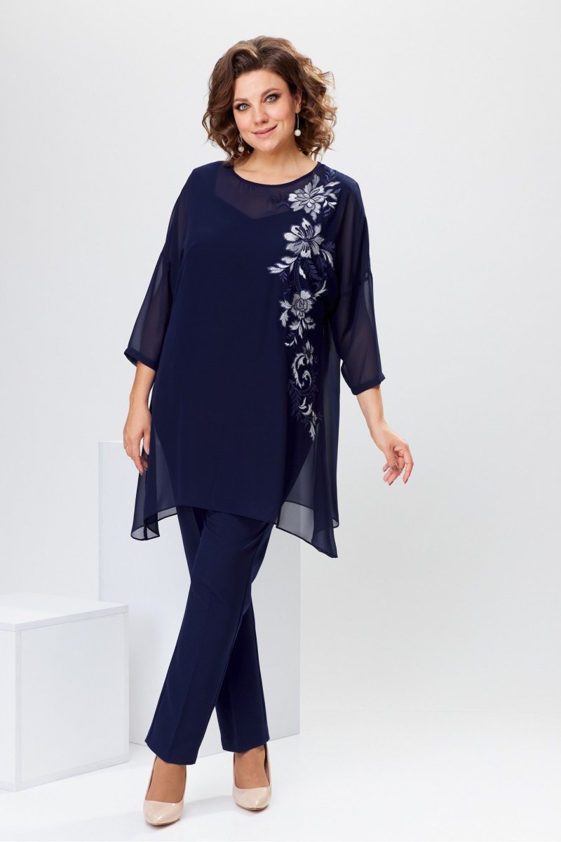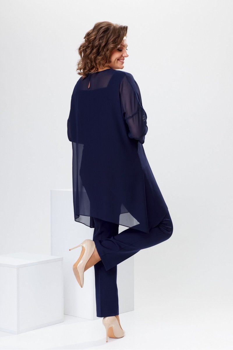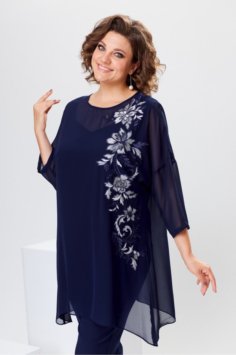 Комплект женский относится к нарядной торжественной одежде. Комплект женский трехпредметный: блузка, топ и брюки. Блузка женская прямого силуэта, с фигурным низом, со спущенной проймой. Перед цельнокроеный, декорирован кружевом. Спинка цельнокроеная. Горловина круглая, обтачная, без воротника. Рукав одно шовный, длиной 7/8. Топ женский, длиной до линии бедер. Перед цельнокроеный, с двумя нагрудными вытачками. Спинка цельнокроеная. Горловина фигурная, обтачная. Бретели широкие обтачный. Брюки длинные, слегка заужены книзу. Передние и задние половинки с двумя талиевыми вытачками. Застежка на тесьму-молнию. Верхний срез с притачным поясом, застегивающимся на одну обметанную петлю и одну пришивную пуговицу. Между боковым швом и вытачкой на задних половинках собран на эластичную тесьму. Длина топа 57 см. Длина блузки 79.5 см, длина рукава 57-58-59 см соответственно. Длина брюк 102 см.