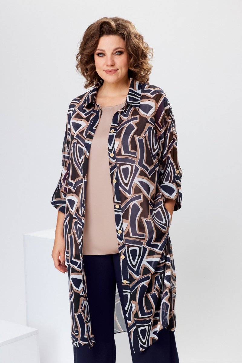 Комплект женский 3-х предметный кардиган, топ и брюки. Кардиган женский прямого силуэта, длиной ниже колена на 5 см. Перед с 2-мя притачными вертикальными планками. Спинка цельнокроеная. Горловина круглая с втачным воротником рубашечного типа с отрезной стойкой. Застёжка центральная на 9-тьпроьивных металлических кнопки. Боковые швы с разрезами. Кардиган со спущенным плечом. Рукав втачной, одно шовный, длиной 3/4 с притачной манжетой и хлястиком, поддерживающим манжету и фиксирующимся к рукаву на 1-ну пробивную кнопку. Кардиган без плечевых накладок. Топ женский прямого силуэта, длиной др линии бёдер. Перед с 2-мя нагрудными вытачками. Спинка цельнокроеная. Горловина круглая, обточная, без воротника. Проймы обточные. Брюки длинные прямые. Передние половинки с карманами в боковых швах. Задние половинки с таллиевыми вытачками. Брюки на притачном поясе, собранным на эластичную тесьму, закреплённую 2-мя отделочными строчками. Длина спинки кардигана 106 см, длина рукава 28 см, длина рукава от горловины 55 см. Длина брюк по боковому срезу 102 см. Длина спинки топа 62 см.