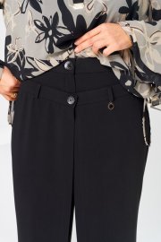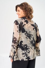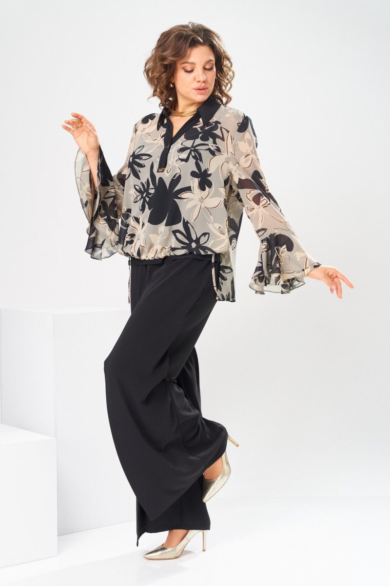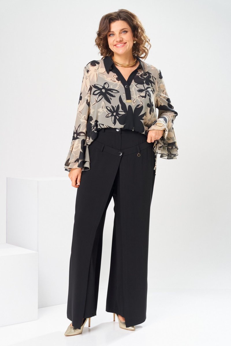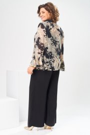 Комплект женский, 3-х предметный, блузка, топ и брюки. Блузка женская прямого силуэта, длиной ниже линии бёдер с низом " ступенька". Перед с 2-мя втачными фигурными планками по горловине с застёжкой на одну обмётанную петлю и одну пришивную пуговицу, шов втачивания декорирован пришивной металлической пластиной. Спинка цельнокроенная. Боковые швы с разрезами. Низ переда с кулисой с застёжкой на новесные петли пришивные пуговицы доя регулирования высоты переда. Горловина круглая, с втачным воротником, рубашечного типа с отрезной стойкой, втачные планки формируют V-образный вырез. Рукав втачной, оно шовный, длинный, с 2-мя притачными воланами. Блузка с плечевыми накладками. Топ женский, полуприлегающего силуэта, длиной до линии бёдер. перед с 2-мя нагрудными вытачками. спинка цельнокроенная. Длина спинки блузки 65 см, длина рукава 58 см. Длина брюк по боковому шву 103 см, дина брюк по шаговому шву 76 см, ширина брюк внизу 31 см. Длина спинки топа 40 см, ширина спинки 29 см.