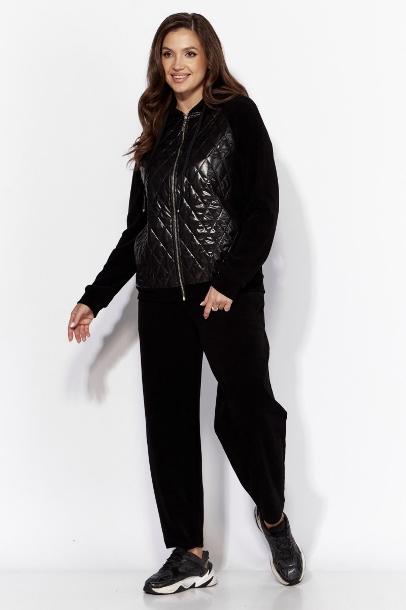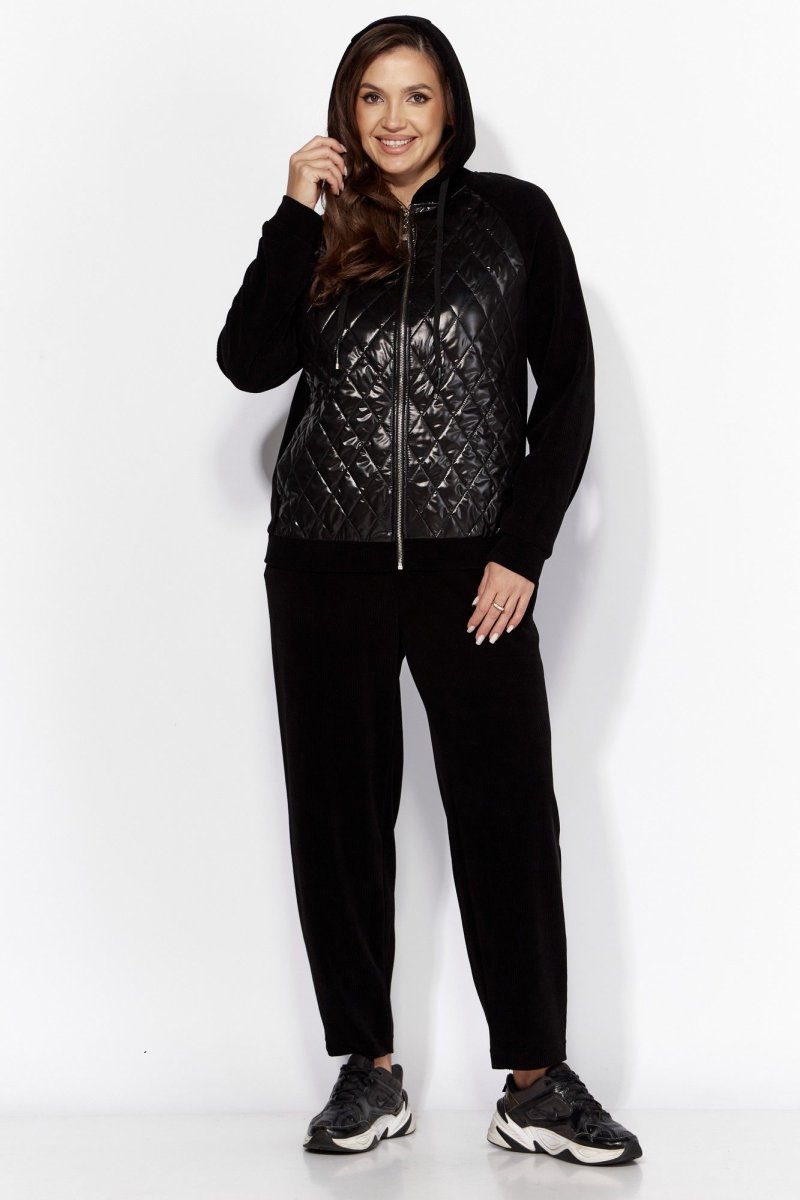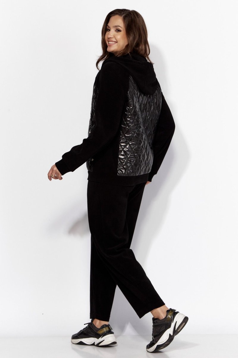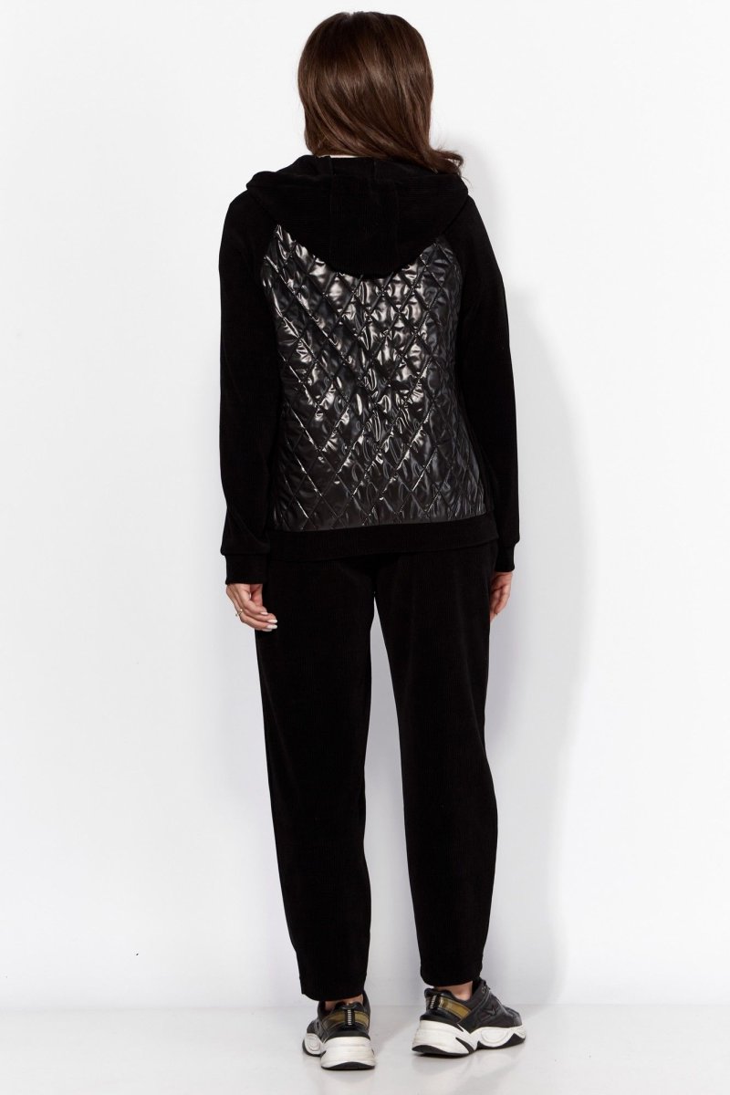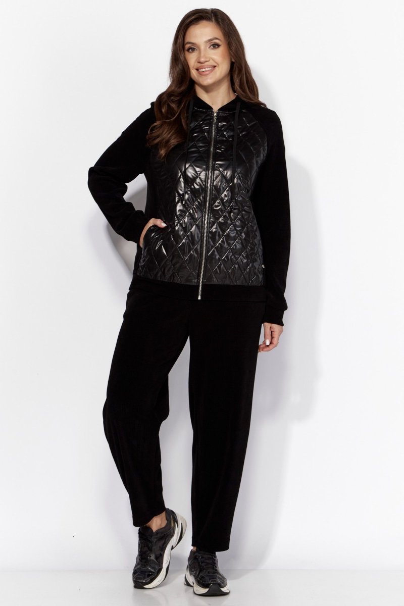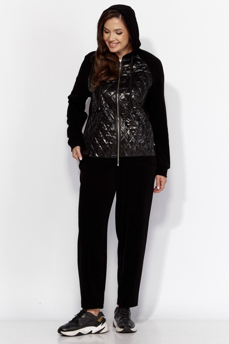 Комплект женский, 2хпредметный, состоящий из куртки и брюк. Куртка прямого силуэта с длинным рукавом. Рукав "реглан" с манжетой по низу. По переду и спинке рельефы из пройм. Спереди, в рельефах, карманы. Застежка центральная , на "молнию". Горловина оформлена капюшоном с кулисой по краю. Низ куртки на манжете. Центральные детали переда и спинки из стежки (плащевка на синтепоне.) Брюки-слаксы, объемные, к низу зауженные. Карманы в боковых швах. Сзади накладной карман с декоративной нашивкой. Пояс цельнокройный, на резинке.