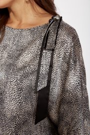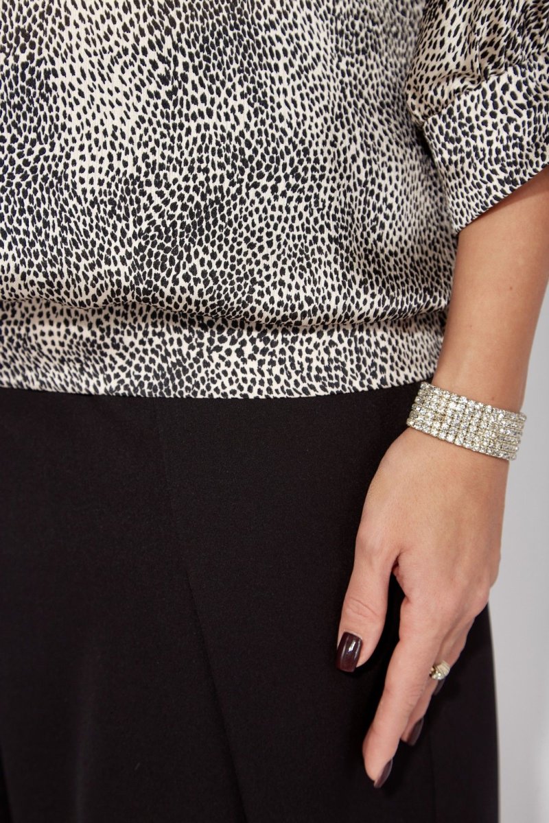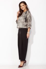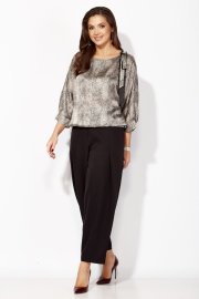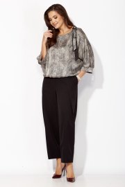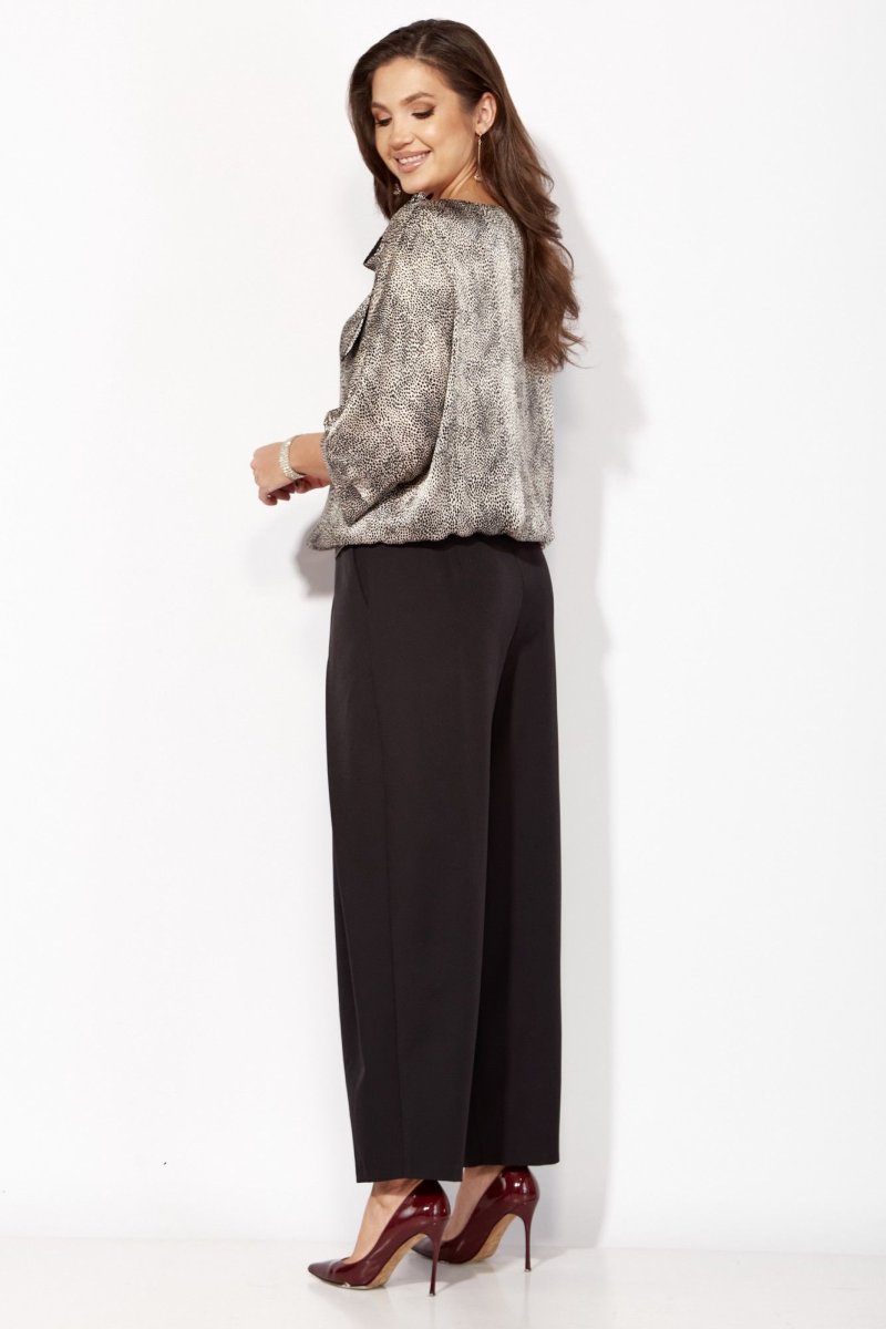 Комплект женский, 2х предметный, состоящий из блузки и брюк. Блузка объемная с цельнокройным рукавом, длинной 3/4. Низ рукава присобран по центру и на манжете. Вырез горловины "лодочка" По низу блузки притачная планка, по спинке с резинкой. Декором служит съемный отделочный элемент. Брюки-шкоды, зауженные к низу. По переду карманы и глубокая, застроченная складка, направленная к боку. Застежка спереди на тесьму "молния"под "гульфик " Пояс притачной , с застежкой спереди на петлю и пуговицу, сзади на резинке.