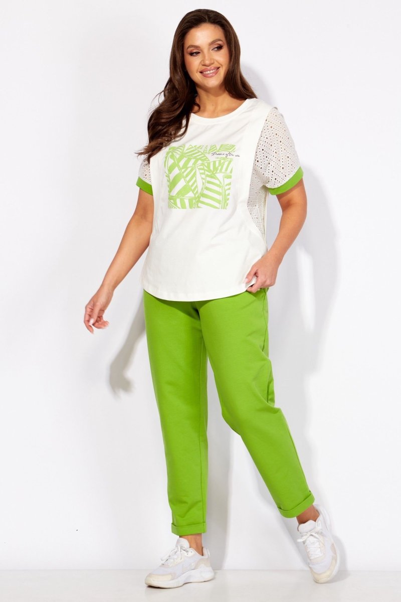 Комплект женский, 2х предметный, состоящий из блузки и брюк. Блузка прямого силуэта, выполнена в сочетании вискозного трикотажного полотна и шитья. Рукав короткий, цельнокроеный с манжетой. По переду и спинке фигурные рельефы с отлетными планками. Горловина круглой формы с подрезной бейкой. Центр переда задекорирован принтом. На спинке кокетка и отделочная нашивка. Низ фигурной формы. Брюки из дресса двухнитка. Прямые, по низу с отворотами. По переду карманы. Пояс отрезной с отделочной кулисой и резинкой по кругу.