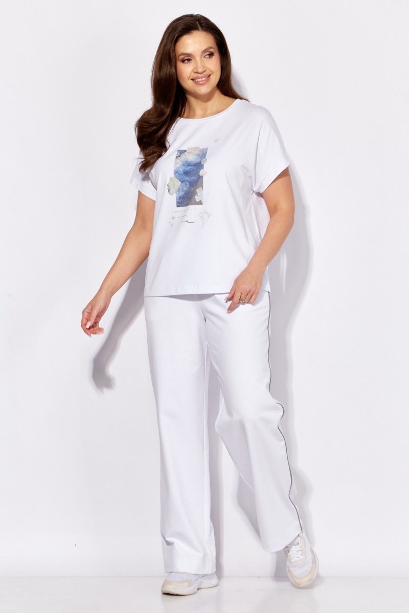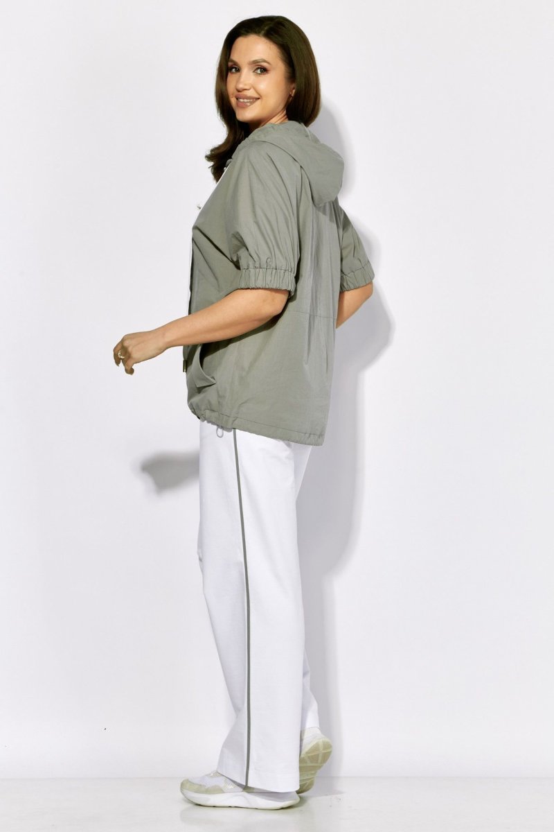 Комплект женский, 3х предметный, состоящий из ветровки, футболки и брюк. Ветровка прямого силуэта с коротким цельнокроеным рукавом. По низу рукава манжета с резинкой. По переду планки, рельефы и наклонные карманы с клапанами. Застежка центральная на "молнию". Горловина оформлена капюшоном с кулисой из отделочного шнура. По спинке средний шов, подрез и декоративная нашивка. Низ куртки по спинке чуть опущен, с притачной планкой и кулисой из резинки с фиксаторами, для регулировки ширины по низу. Футболка с коротким спущенным рукавом. Горловина круглой формы. Перед задекорирован принтом. Брюки прямые, с кантами по боковым швам. По переду наклонные карманы. Пояс притачной с резинкой по кругу.