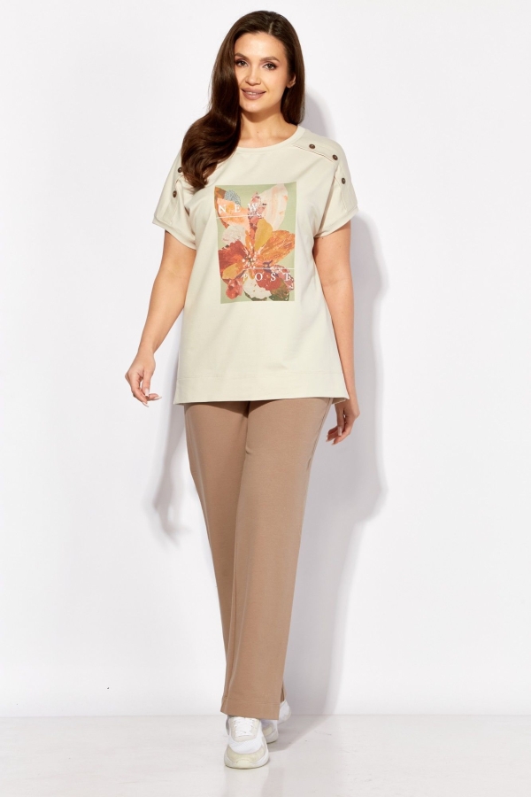 Комплект женский, 2х предметный, состоящий из блузки и брюк. Блузка прямого силуэта, выполнена в сочетании вискозного трикотажного полотна и шитья. Рукав короткий, цельнокроеный с манжетой. По переду и спинке фигурные рельефы с отлетными планками. Горловина круглой формы с подрезной бейкой. Центр переда задекорирован принтом. На спинке кокетка и отделочная нашивка. Низ фигурной формы. Брюки из дресса двухнитка. Прямые, по низу с отворотами. По переду карманы. Пояс отрезной с отделочной кулисой и резинкой по кругу.