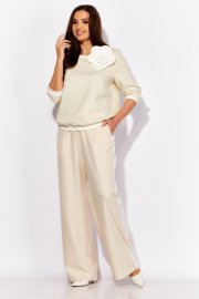 Горловина круглой формы, с подрезной эластичной бейкой(кашкарсе) По низу рукава и низу джемпера притачные манжеты из эластичного трикотажного (кашкарсе) Декором служит съемный цветок из отделочной ткани. Брюки прямые, с лампасами из отделочной ткани. По переду наклонные карманы. Пояс притачной, с гладкой центральной частью и резиной по кругу.