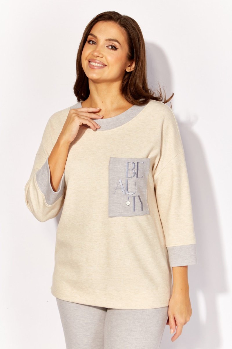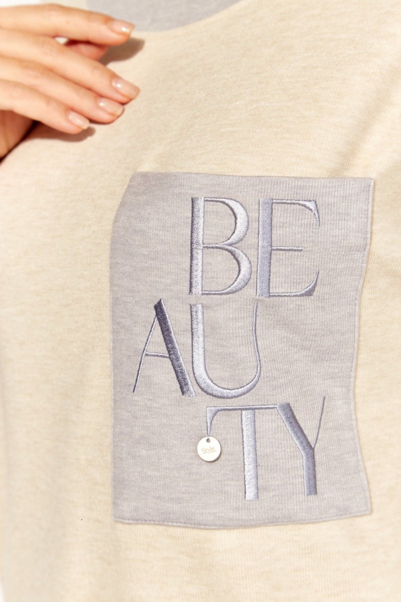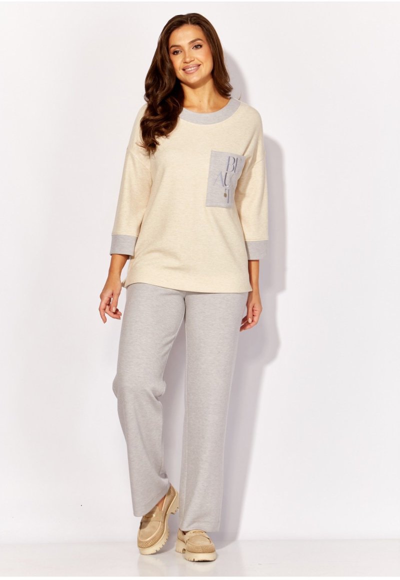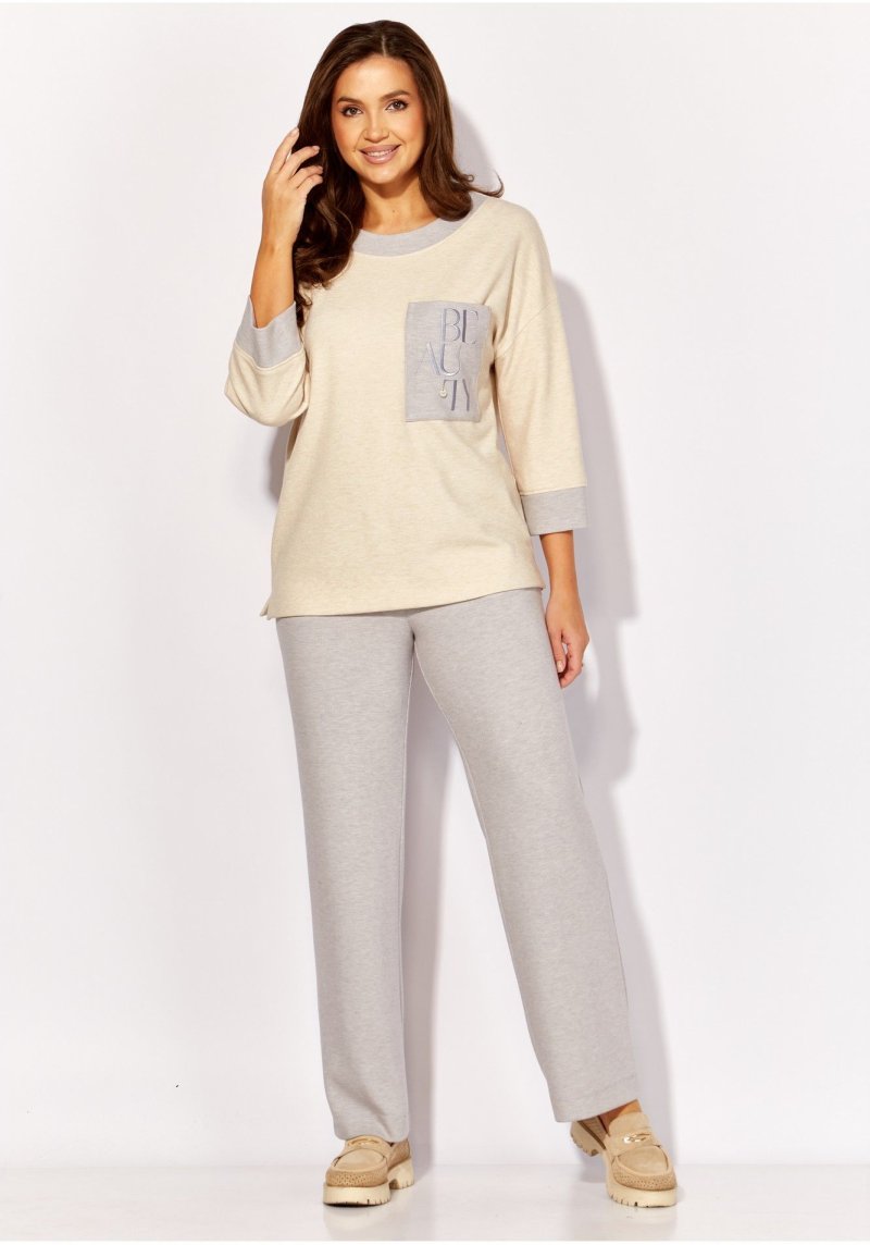 Комплект женский, 2х предметный, состоящий из джемпера и брюк. Джемпер прямого силуэта с рукавом длинной 7/8. Рукав со спущенной линией плеча и отрезной манжетой по низу. Горловина круглой формы, с подрезной планкой по переду. По бокам разрезы. Акцентом служит накладной карман по переду, задекорированный вышивкой и принтом. Брюки прямые, с наклонными карманами спереди. Пояс притачной, с резинкой по кругу.