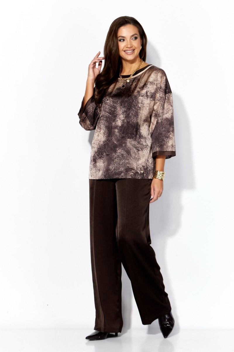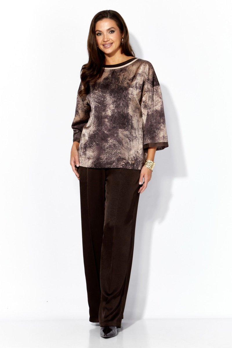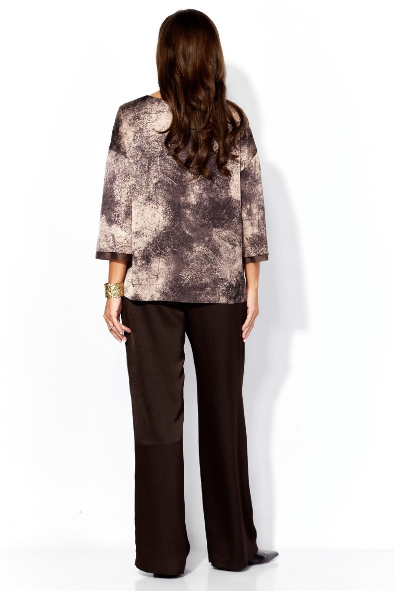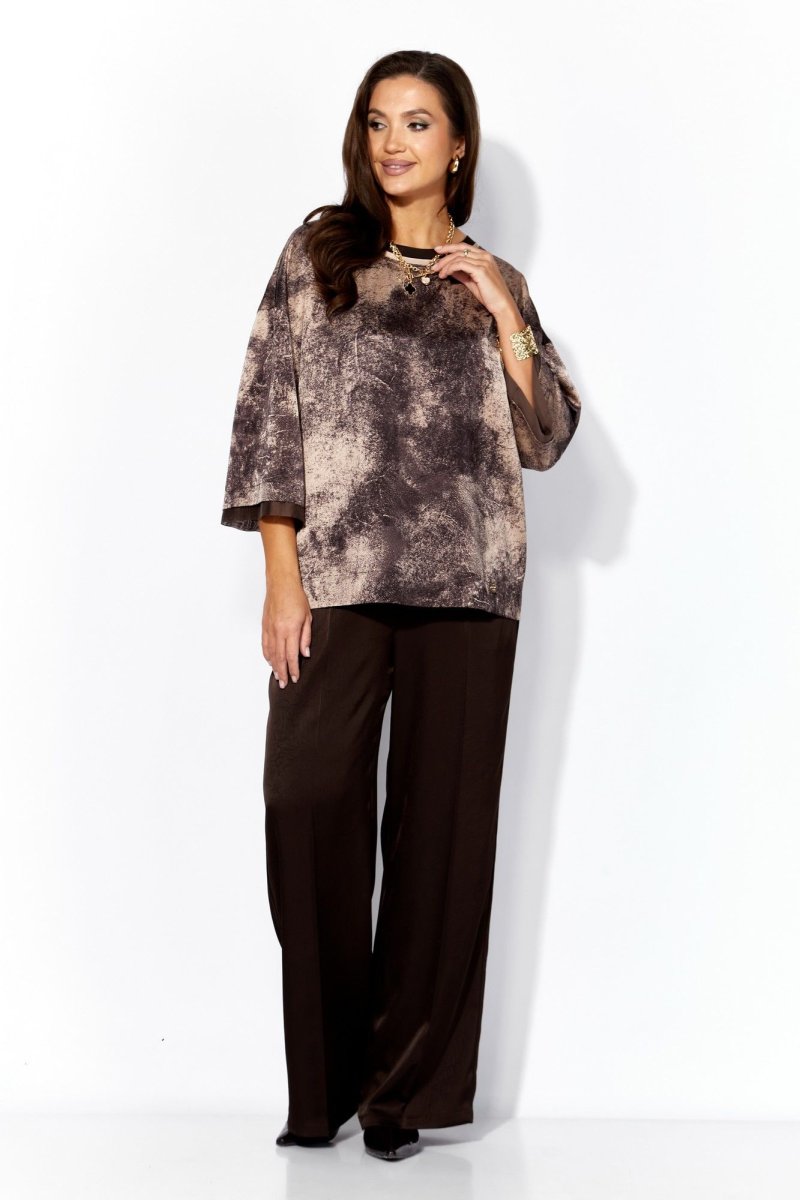 Комплект женский, 2х предметный, состоящий из блузы и брюк. Блуза прямого силуэта с рукавом длинной 3/4. Рукав со спущенной линией плеча. По низу рукава планка, с отлетными деталями из отделочной ткани (вуалька) Горловина круглой формы с отделочной планкой и кантом. Снизу, по переду пришивная декоративная "монетка" брюки прямые, по переду заутюжены канты (стрелки) и функциональные наклонные карманы. Пояс притачной с резинкой по кругу.