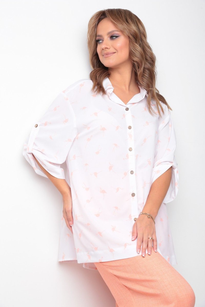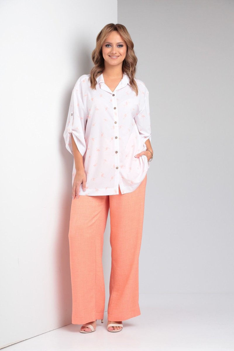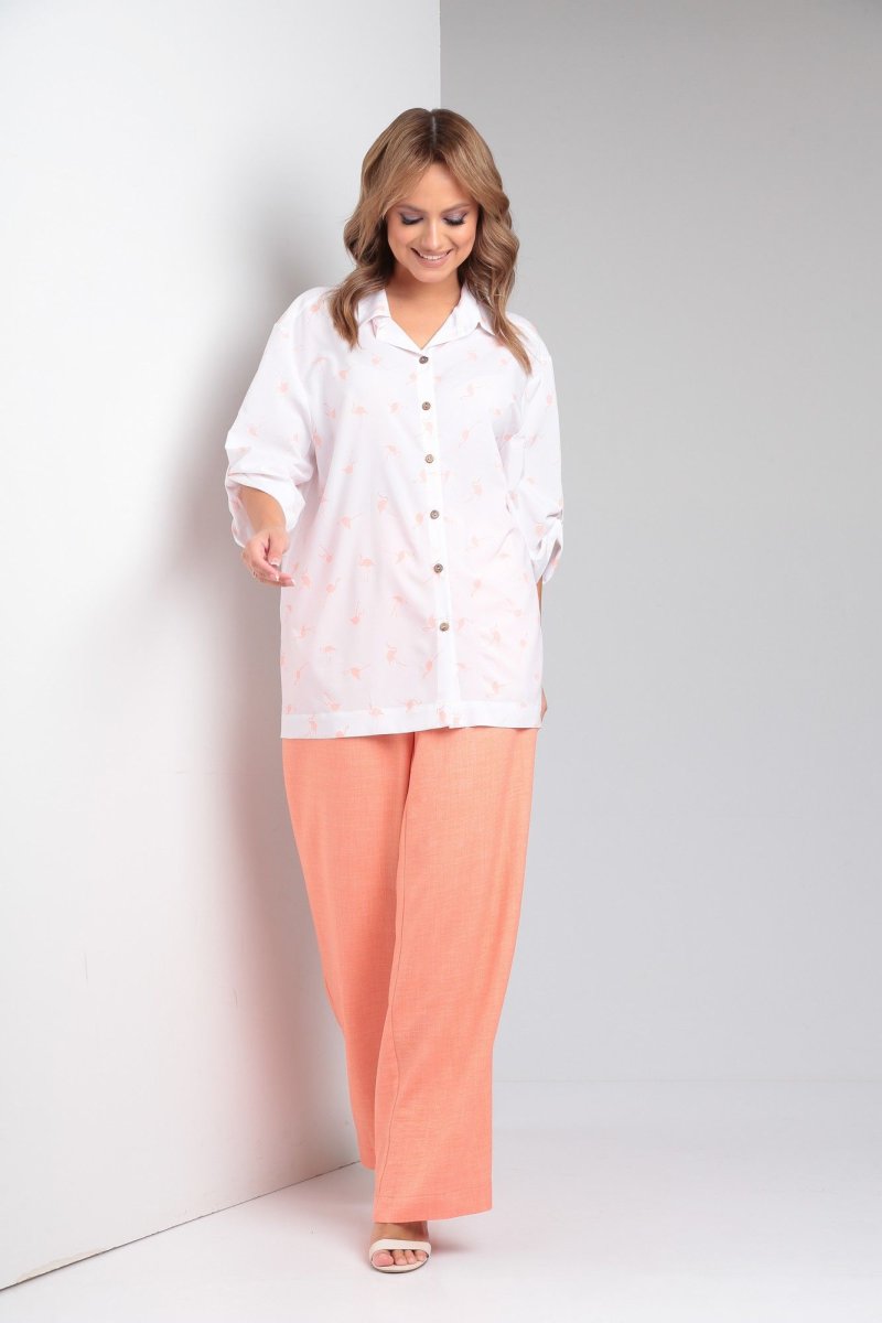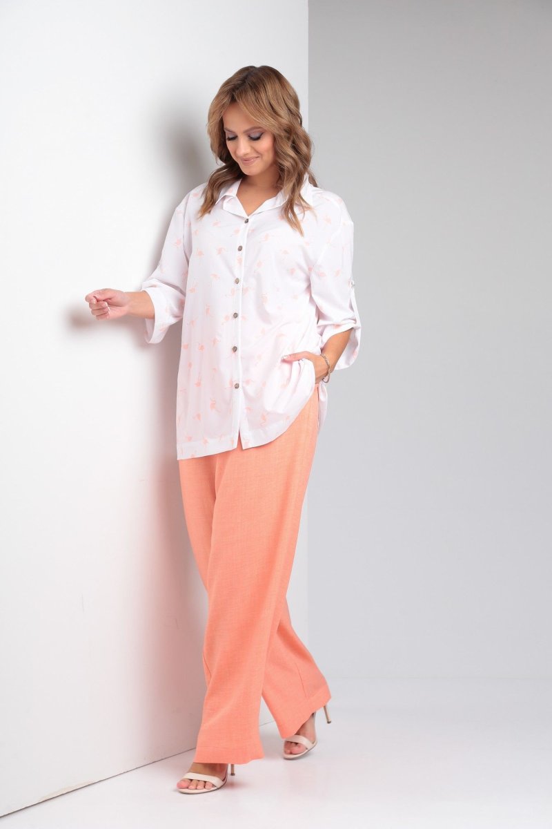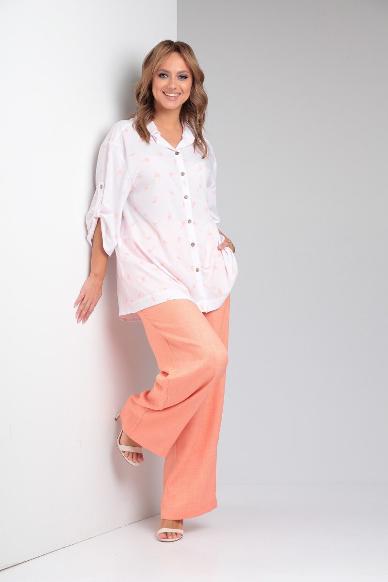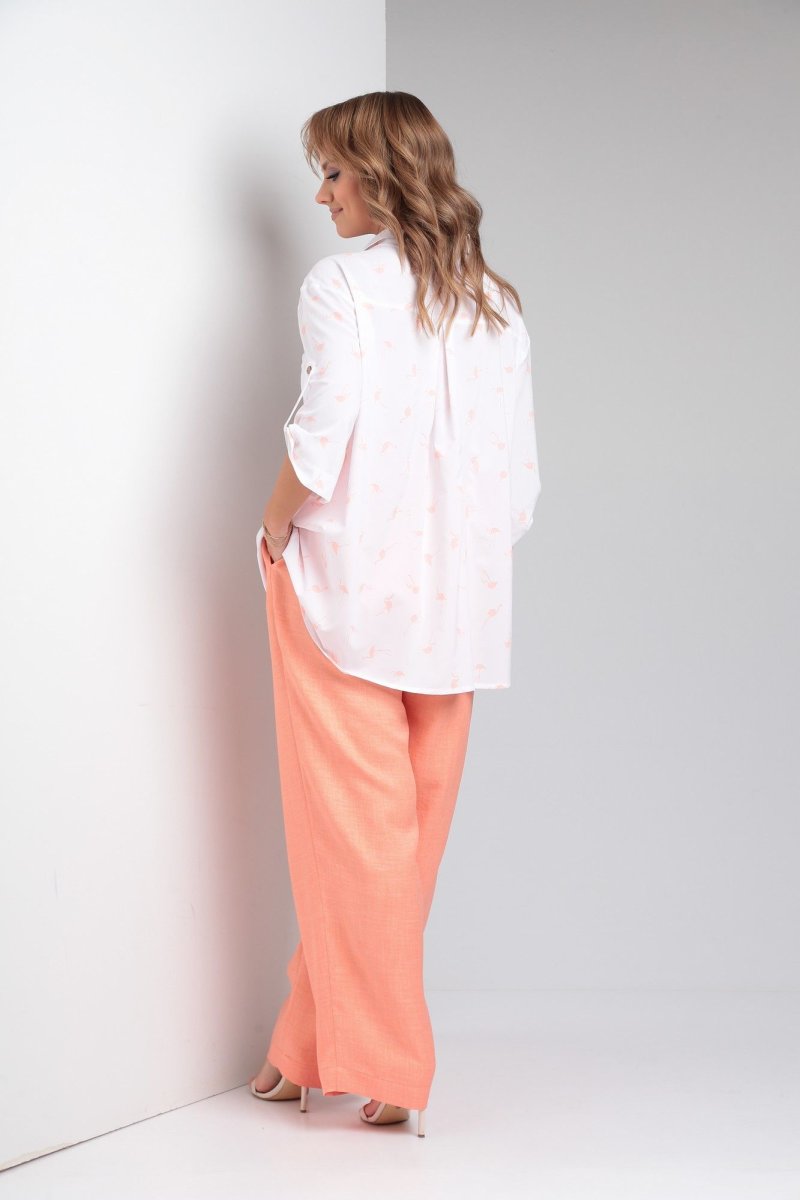 Комплект женский свободного покроя состоит из рубашки и брюк. Рубашка выполнена из легкой плательно-костюмной ткани. По переду застежка на петли-пуговицы, по спинке кокетка. Рукав втачной, линия плеча спущена, длина рукава регулируется отделочной патой. Воротник рубашечного типа. Брюки прямые свободные с поясом на резинке, в боковых швах функциональные карманы.