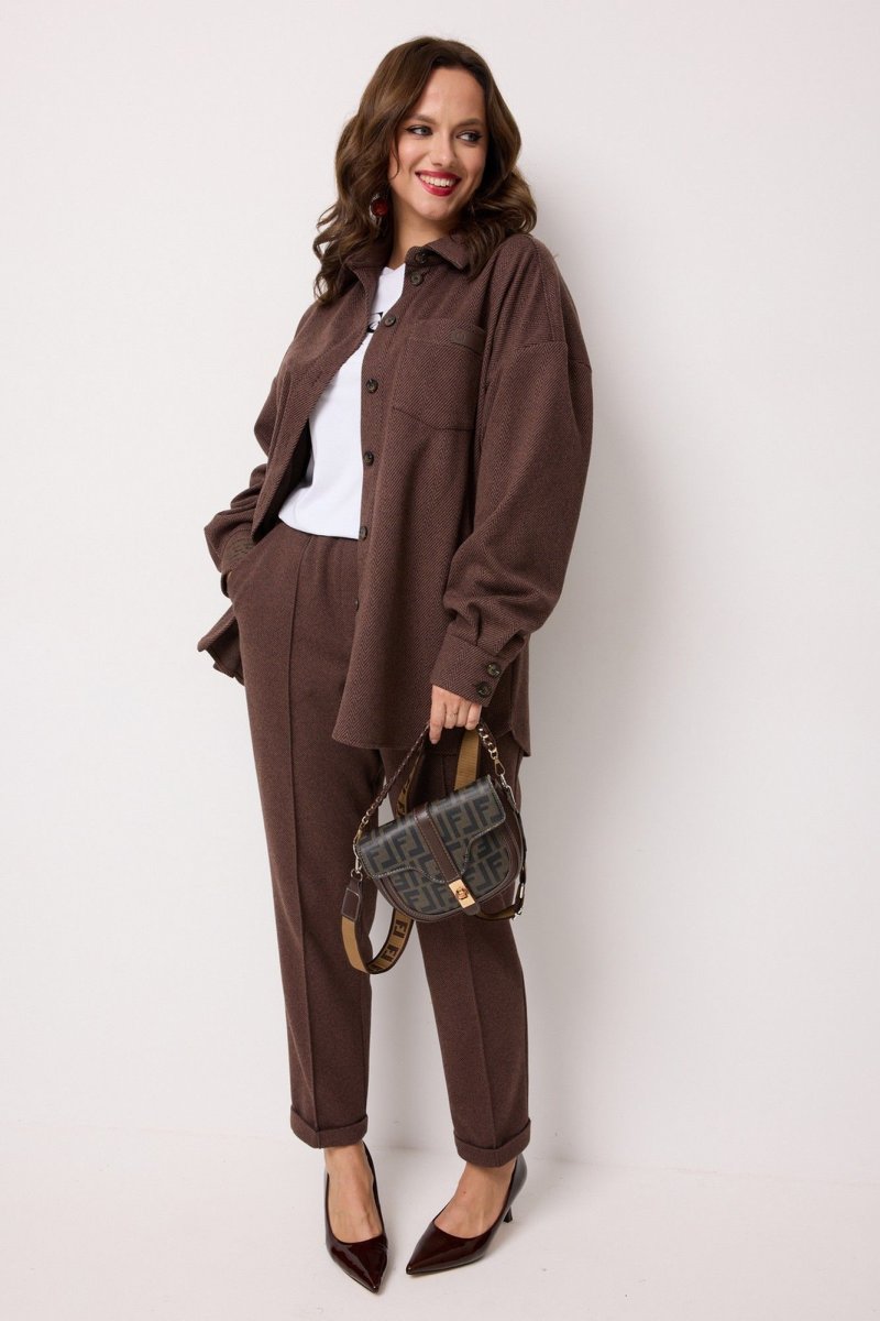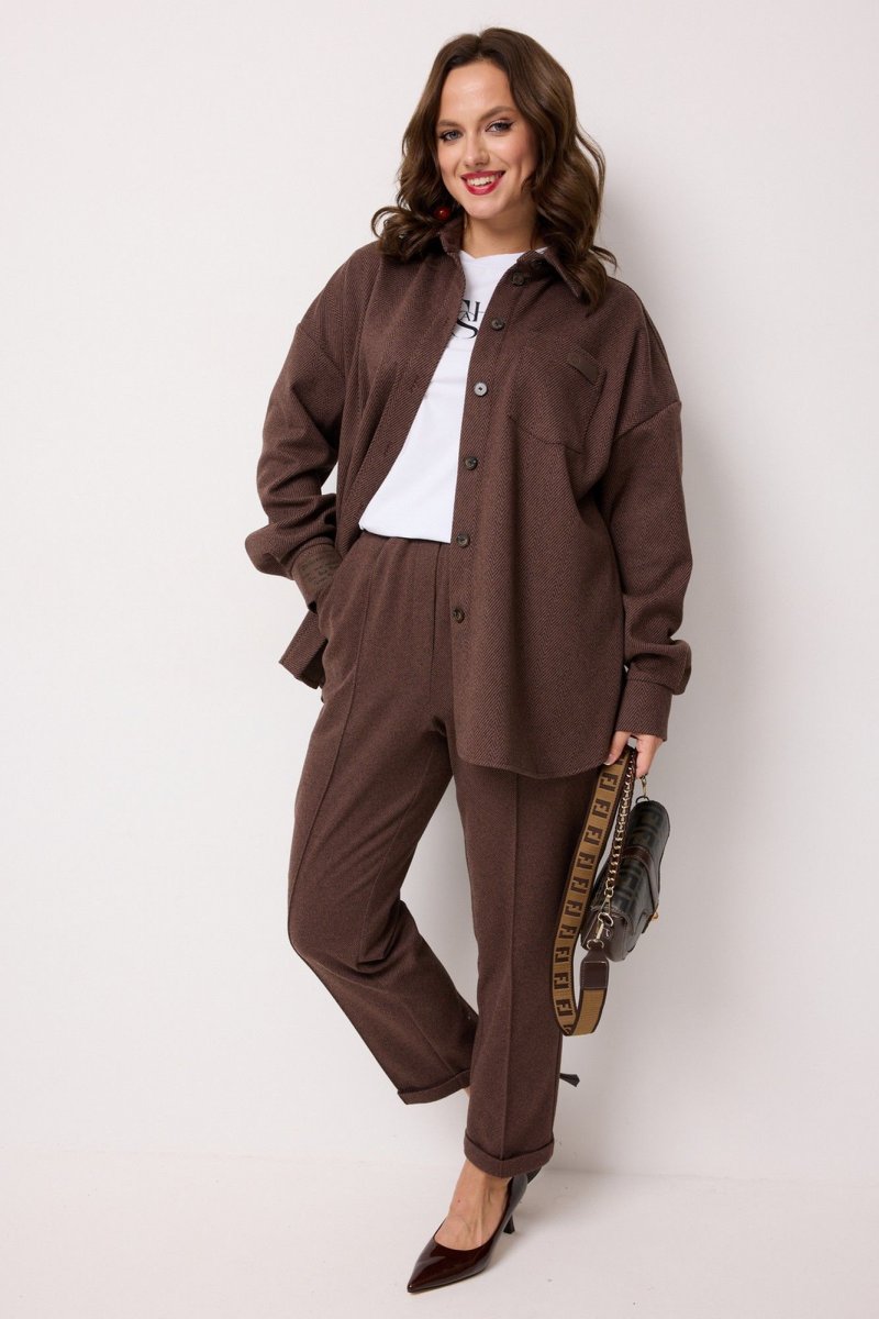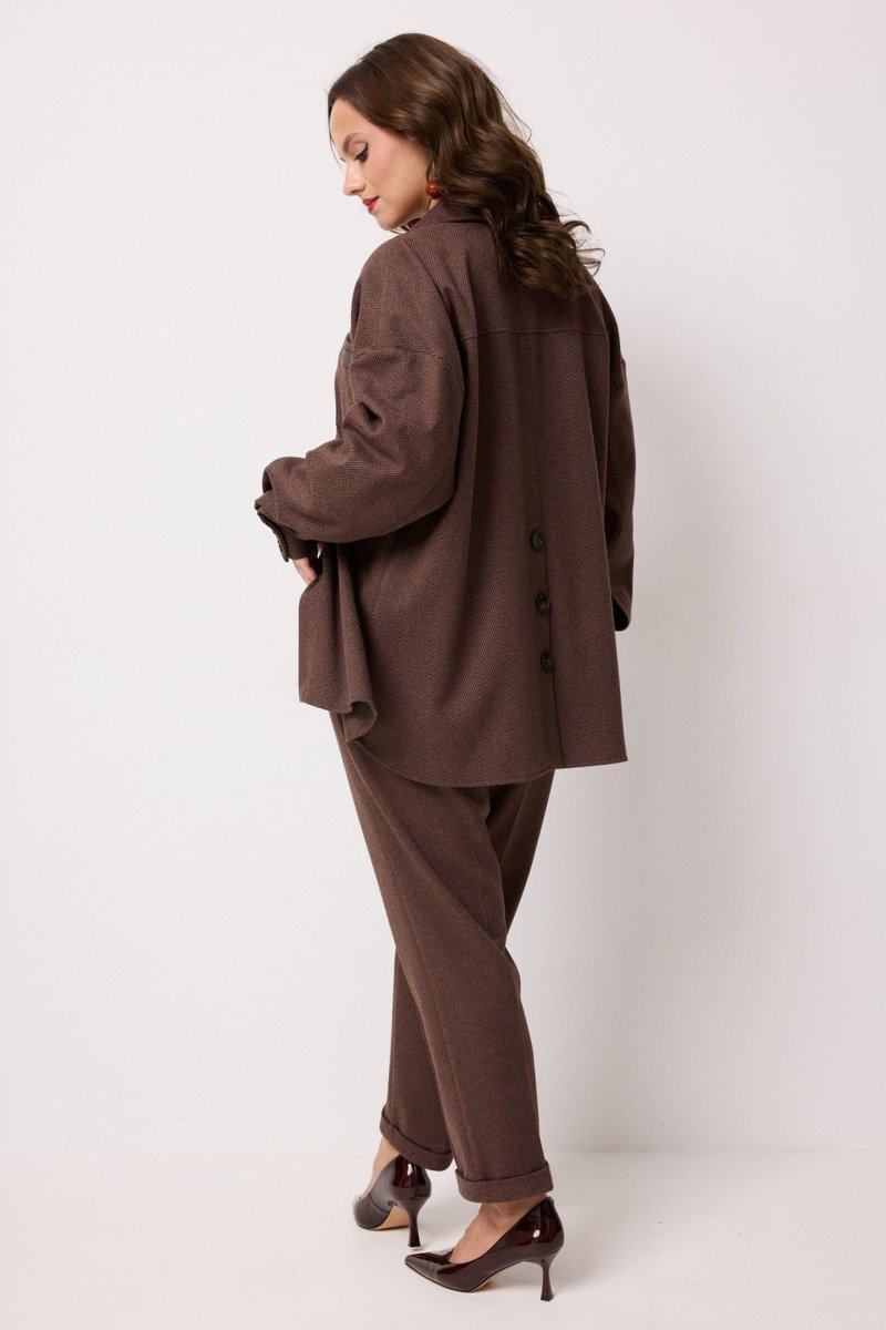 Комплект женский 2-х предметный, состоящий из рубашки и брюк. Рубашка выполнена из поливискозы с принтом "елочка". Рубашка длиной до середины бедра, прямого силуэта, с центральной застёжкой на петли и пуговицы. Горловина рубашечного типа. Блуза со спущенной линией плеч. Рукава длинные, по низу обработана шлица и притачные манжеты, которые застёгиваются на 2 петли и пуговицы. На одной манжете настрочена декоративная нашивка. В области груди, с одной стороны, накладной карман с декоративной нашивкой. Спинка с кокеткой и со средним швом, в котором обработана шлица, застегивающаяся на 3 петли и пуговицы. Низ рубашки закруглен. Брюки выполнены из поливискозы однотонного компаньона. Брюки прямого силуэта, слегка заужены к низу. Низ брюк с цельнокроеной манжетой. Брюки с отстроченными по переду стрелками и заутюженными по задним половинкам. Верхний срез обработан притачным поясом, в который вставлена резинка. По центру переда - застёжка-обманка. В боковых швах расположены наклонные карманы.