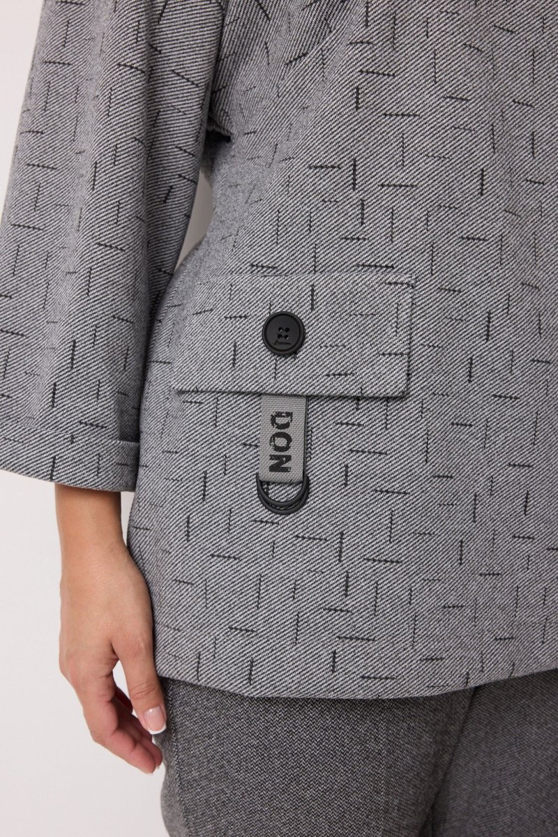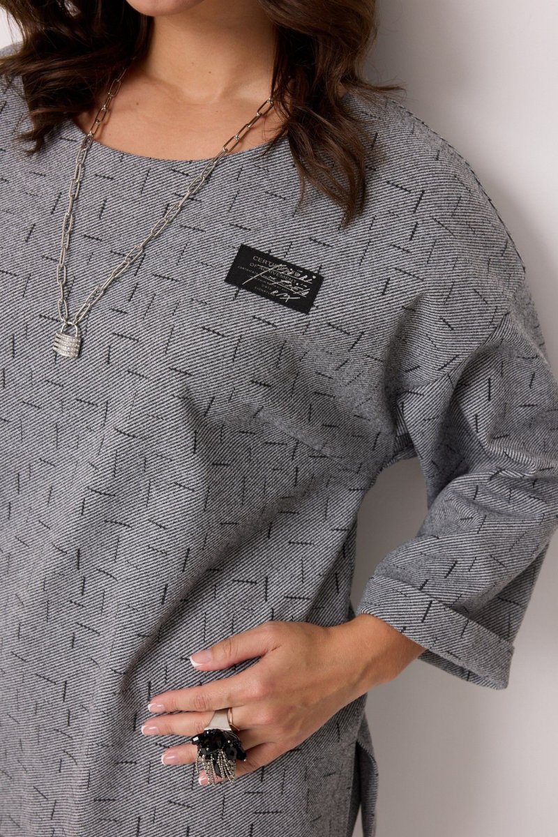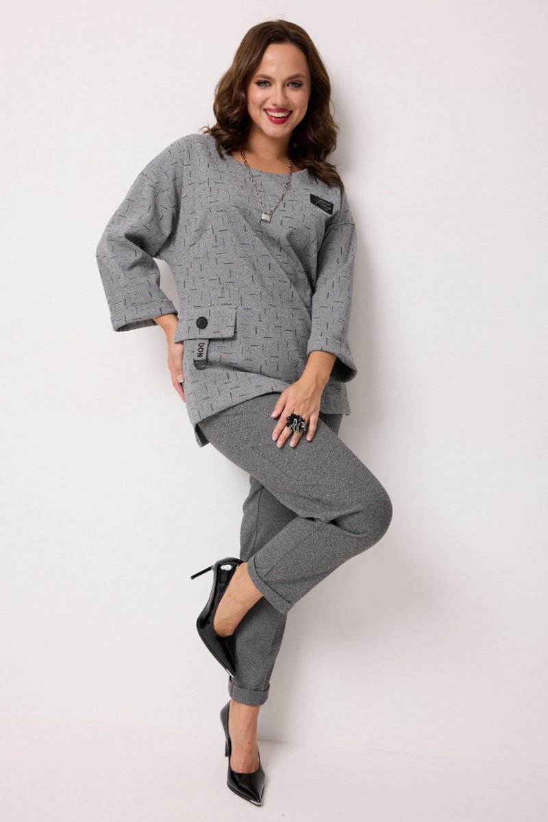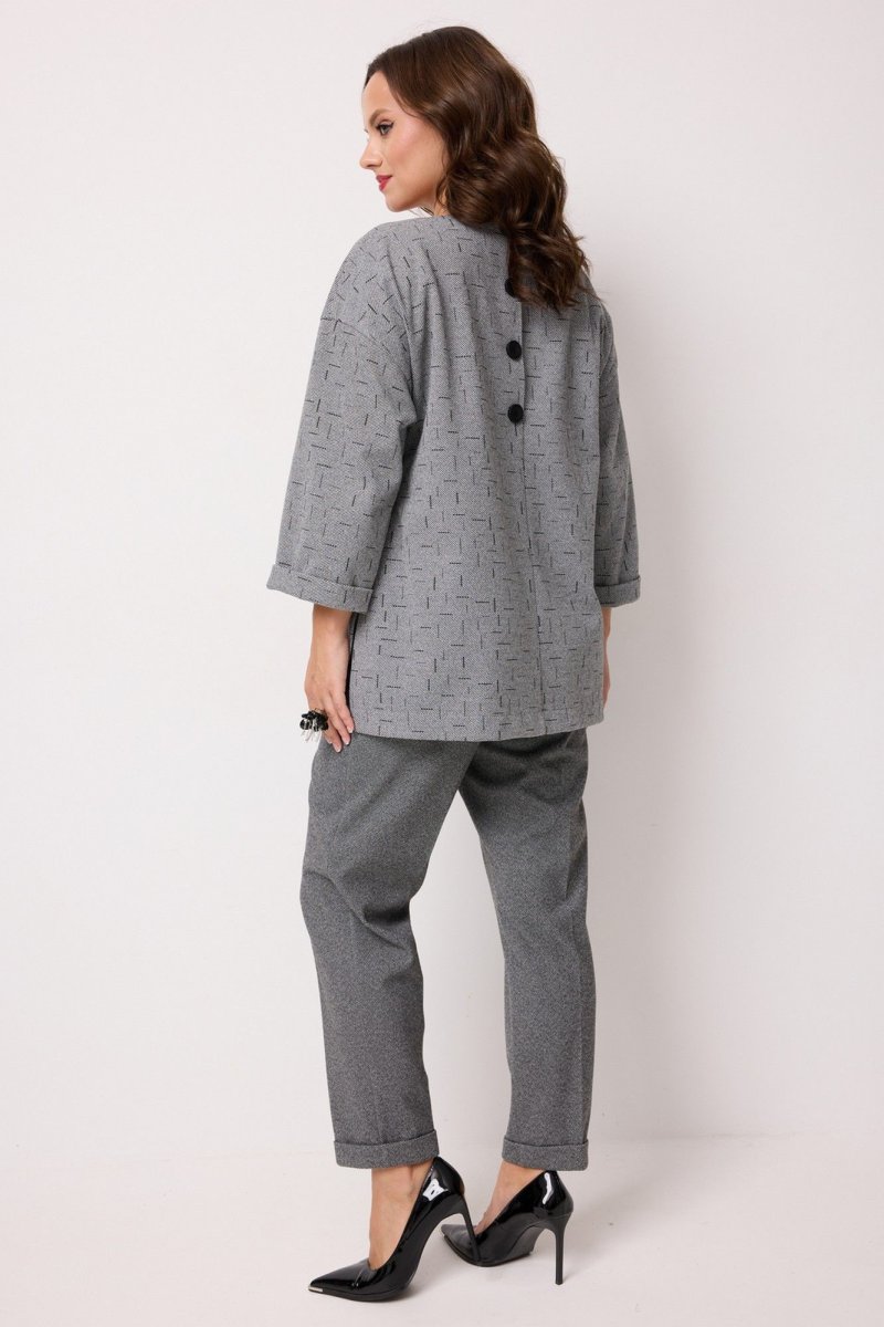 Костюм женский 2-х предметный, состоящий из блузы и брюк. Блуза выполнена из поливискозы с принтом "штрихи". Блуза длиной до середины бедра, прямого силуэта. Горловина круглой формы. Рукава двухшовные длиной 3/4, с манжетой. Перед с нагрудными вытачками, выходящими из бокового шва. В области груди расположена декоративная нашивка. В области бедра настрочен клапан с декоративной тесьмой и пряжкой, который зафиксирован пуговицей. Спинка со средним швом и декоративной шлицей с пуговицами в верхней части спинки. По низу боковых швов обработаны разрезы. Брюки выполнены из полизивкозы однотонного компаньона. Брюки прямого силуэта, слегка заужены к низу. Них брюк с цельнокроеной манжетой. Брюки со стрелками по передним и задним половинкам. Верхний срез обработан притачным поясом, в который вставлена резинка. По центру переда - застёжка-обманка. На задних половинках расположны талиевые вытачки. В боковых швах расположены наклонные карманы.