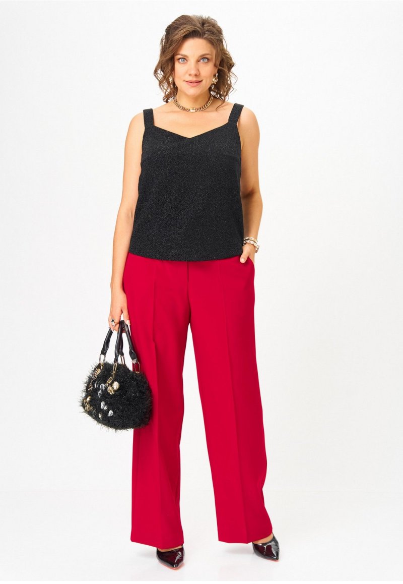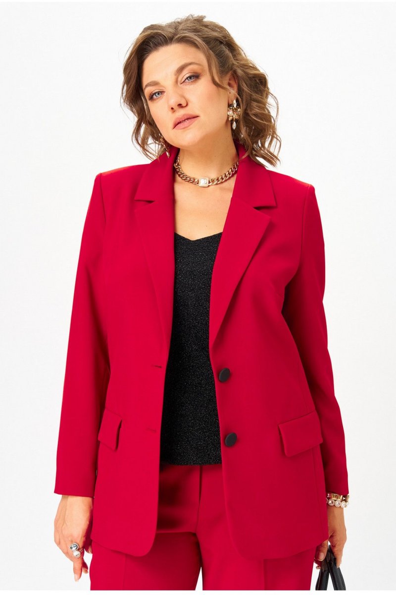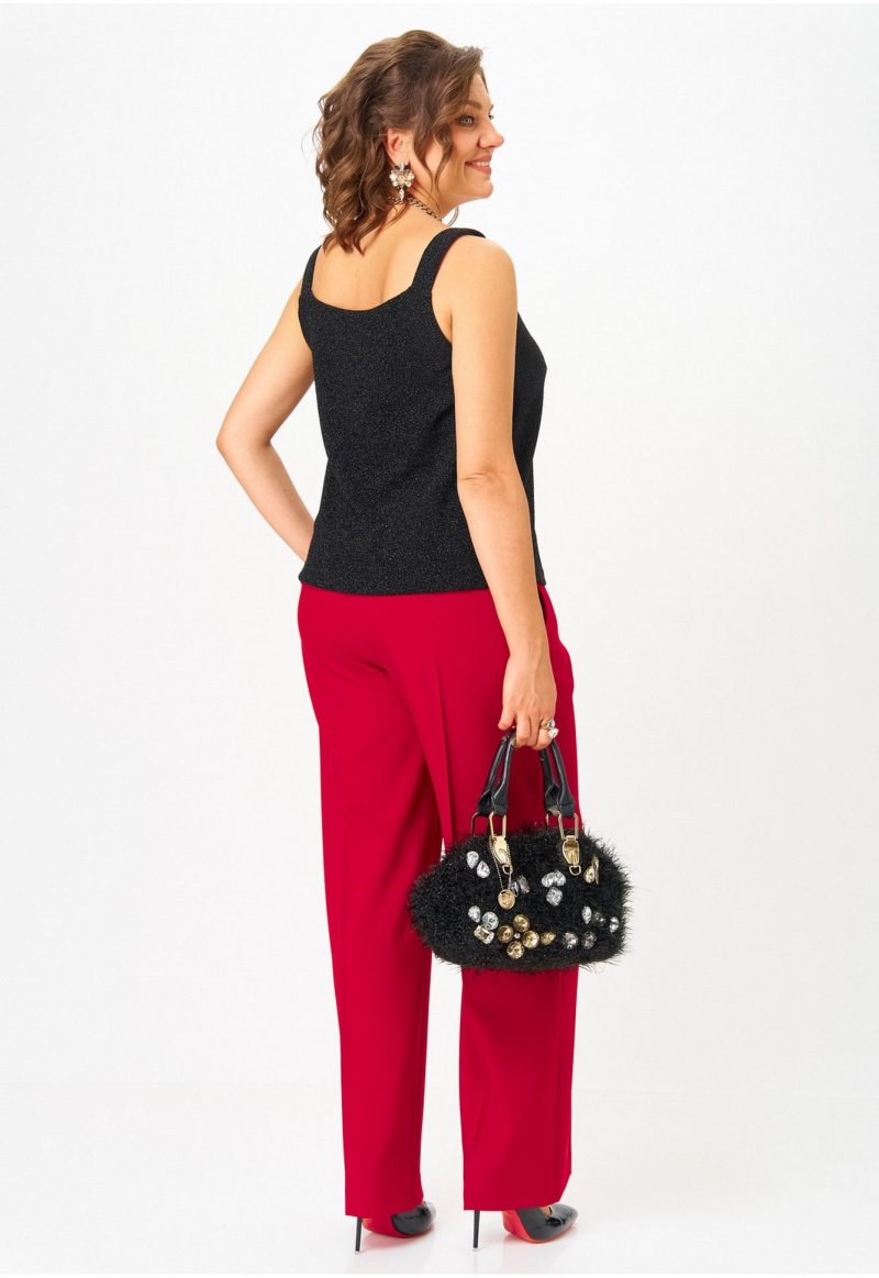 Комплект женский 3-х предметный, состоящий из жакета, топа и брюк. Жакет прямого силуэта, с застежкой на две петли и две пуговицы, на контрастной подкладке из поливискозы. Перед жакета с нагрудными вытачками и прорезными карманами с клапаном. Спинка жакета со средним швом. Рукава двухшовные втачные. Горловина оформлена воротником пиджачного типа. Брюки классической формы, прямого силуэта, со стрелками по передним и задним половинкам. Верхний срез обработан обтачным поясом. В боковых швах брюк обработаны наклонные карманы. Застёжка центральная на тесьму-молнию и крючок. В модели использована фурнитура контрастного цвета. Топ прямого силуэта на широких бретелях, выполнен из трикотажного полотна с люрексом. Перед с нагрудными вытачками. Горловина переда лёгкой V-образной формы. Спинка цельнокроеная.