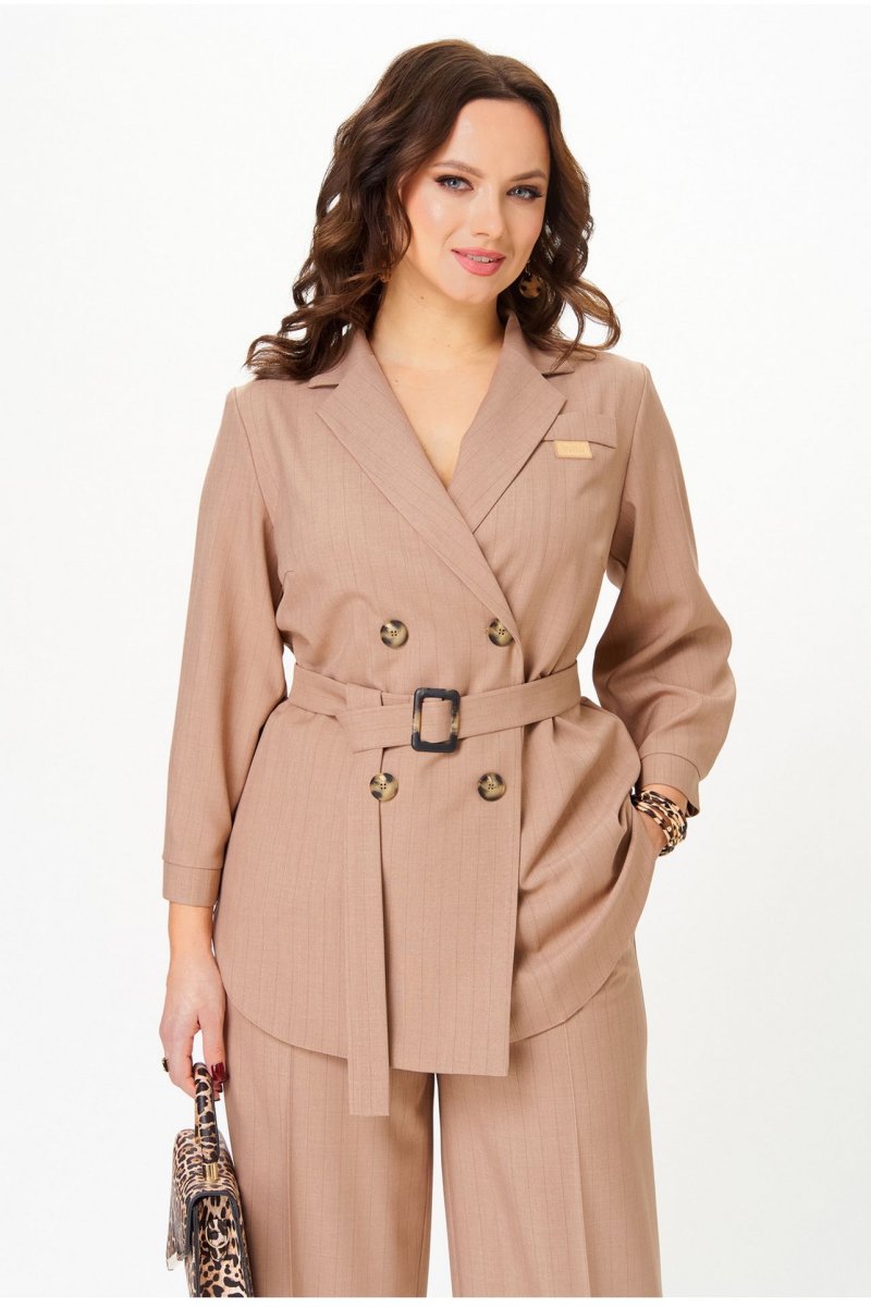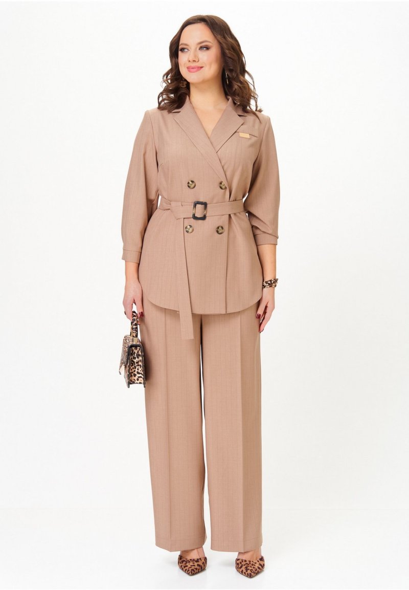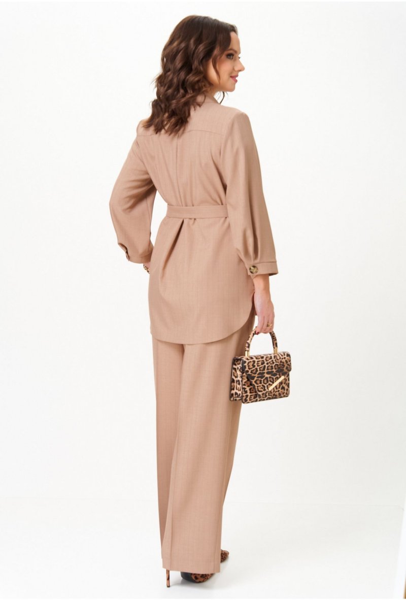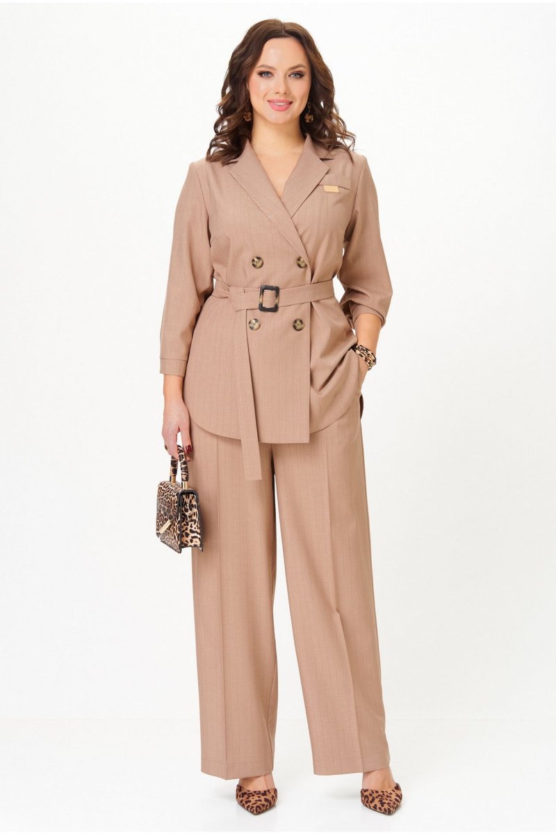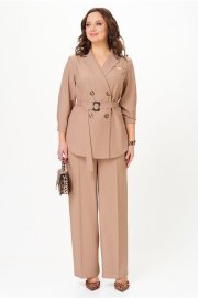 Костюм состоит из жакета и брюк. Жакет без подкладки прямого силуэта, с двубортной застежкой на петли-пуговицы, длиной до середины бедра. Перед жакета с нагрудными вытачками, в области груди расположена декоративная листочка и нашивка. Спинка с двойной кокеткой, в шве притачивания которой обработана встречная складка. Низ жакета фигурный, с закруглениями по боковым швам. Рукава двушовные, длиной 3/4, по низу с манжетой, застегивающейся на петлю и пуговицу. Горловина оформлена воротником пиджачного типа. Брюки классической формы, прямые от линии бедер, со стрелками по передним и задним половинкам. Верхний срез обработан поясом, в который от бокового шва вставлена резинка по задним половинкам. В боковых швах обработаны наклонные карманы. На задних половинках расположены талиевые вытачки. В комплект входит пояс из основной ткани с декоративной пряжкой.