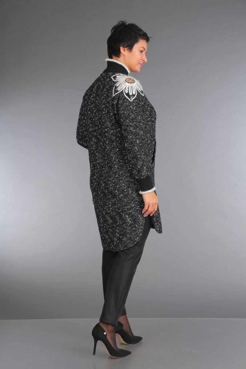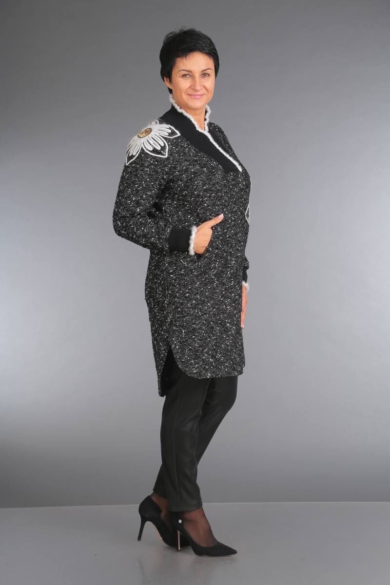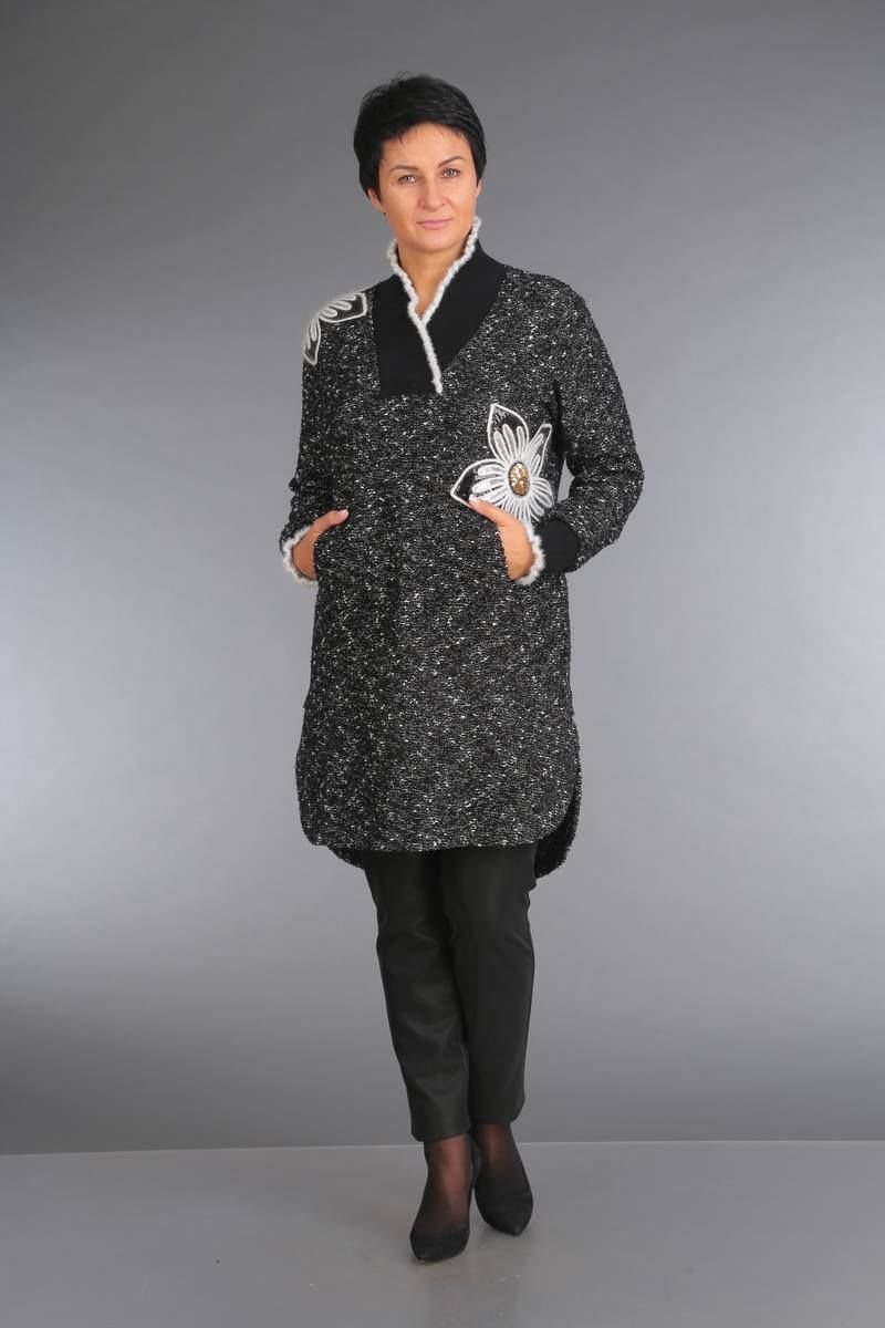 Комплект женский брючный. Туника из трикотажной меланжевой ткани средней растяжимости, декорирована цветами из ангоровой тесьмы и пайеток. Довязы на горловине и манжетах оторочены вязаной тесьмой из ангоры. По переду расположен карман-кенгуру. Длина туники по спинке - 92 см, длина рукава - 62 см. Брюки женские из пластичной трикотажной ткани под кожу на флисе, прилегающего силуэта, высокой посадки. Верхний срез брюк обработан притачным поясом. На передних половинках брюк обработаны карманы. На задних половинках - отрезные кокетки. Длина брюк по боковому шву– 97 см, по шаговому шву – 75 см.