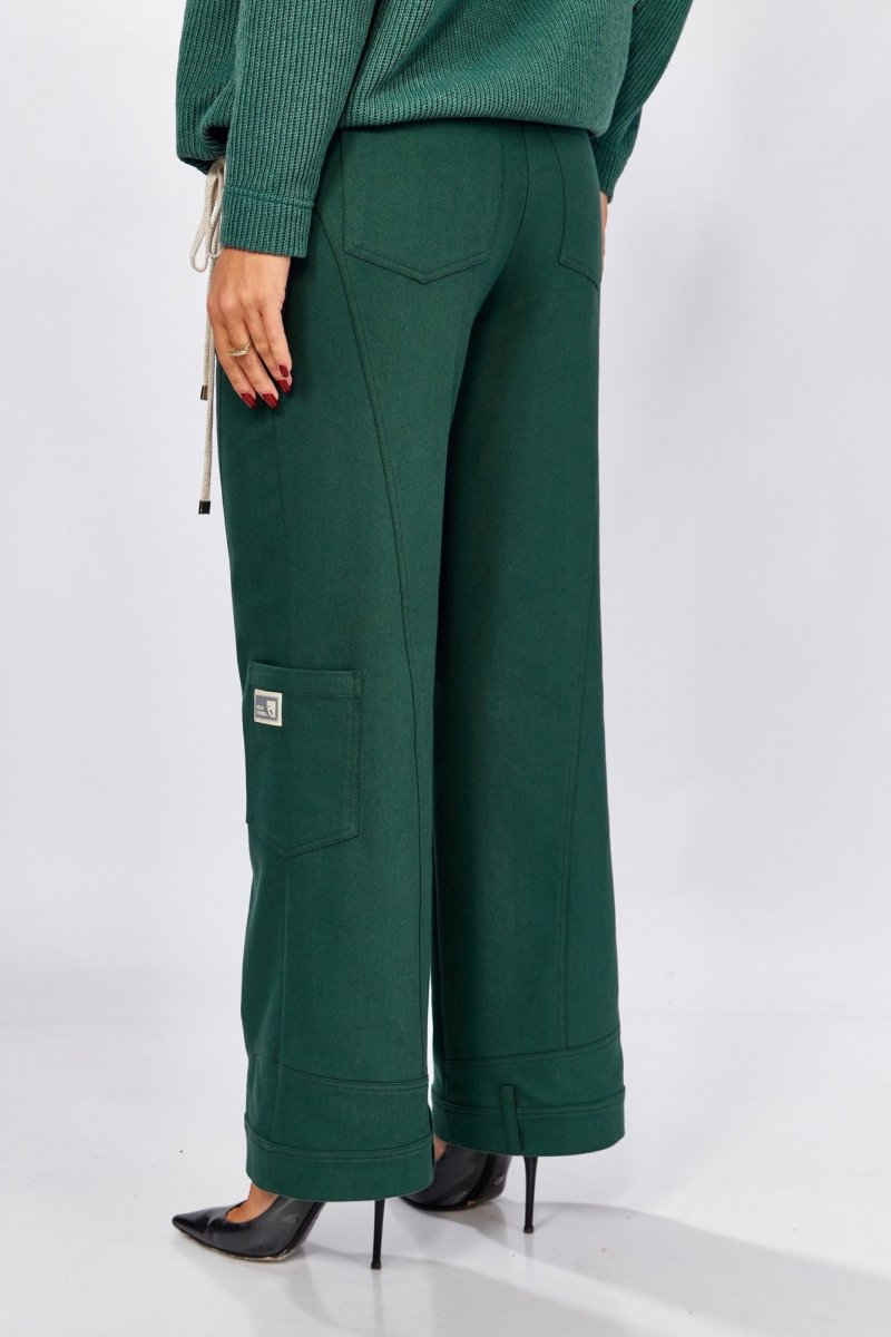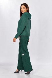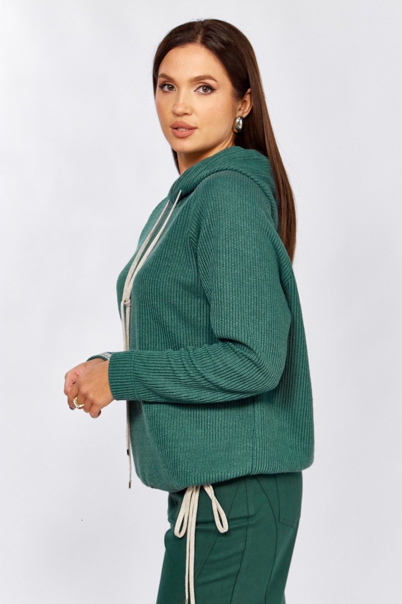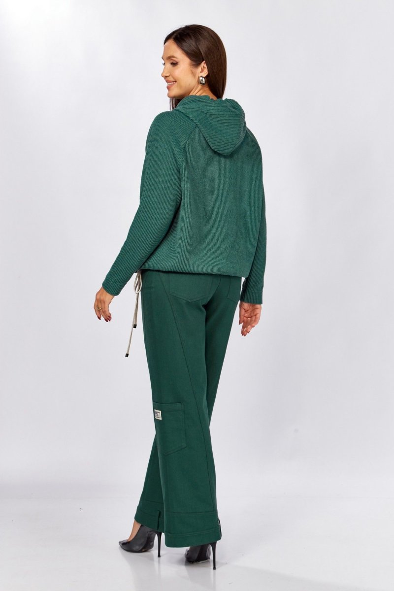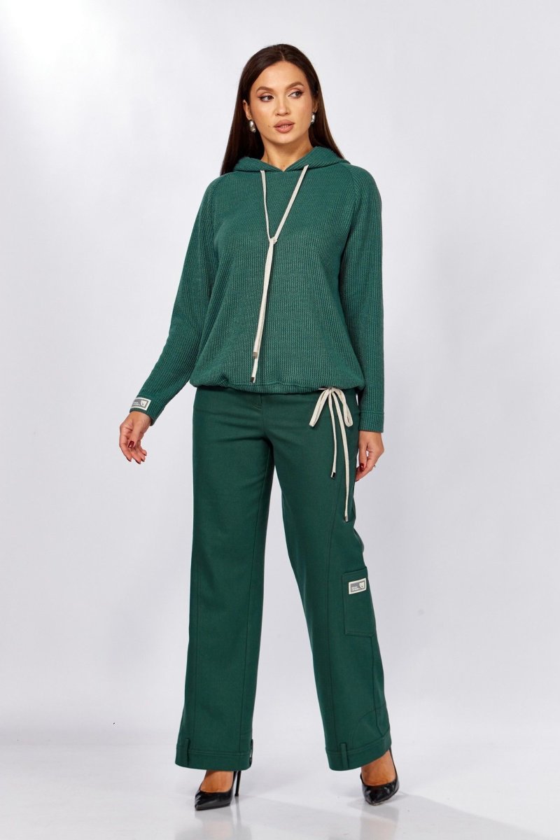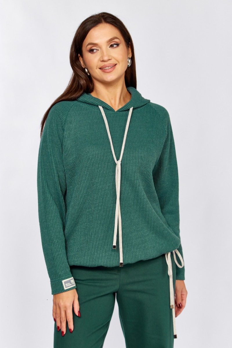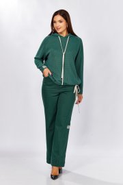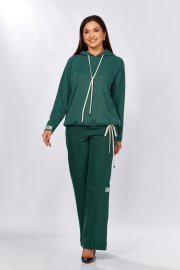 Стильный комплект изумрудного цвета, согреет вас в прохладную осеннюю погоду на прогулке, и не оставит без внимания на работе. Джемпер прямого силуэта с рукавами реглан и капюшоном выполнен из трикотажного полотна. Низ и капюшон с кулиской, в которую продет шнур с декоративными наконечниками.