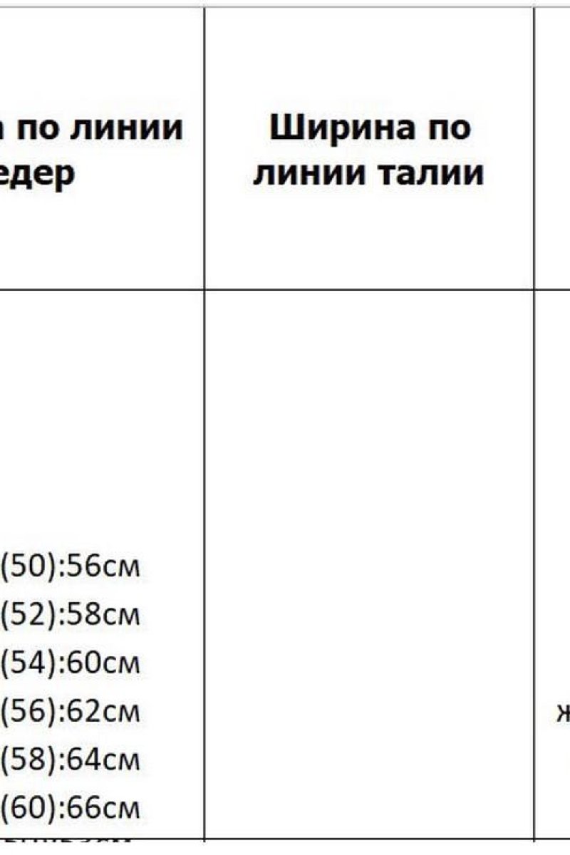 | Размер | Обхват груди (см) Грудь | Обхват талии (см) Талия | Обхват бедер (см) Бедра |