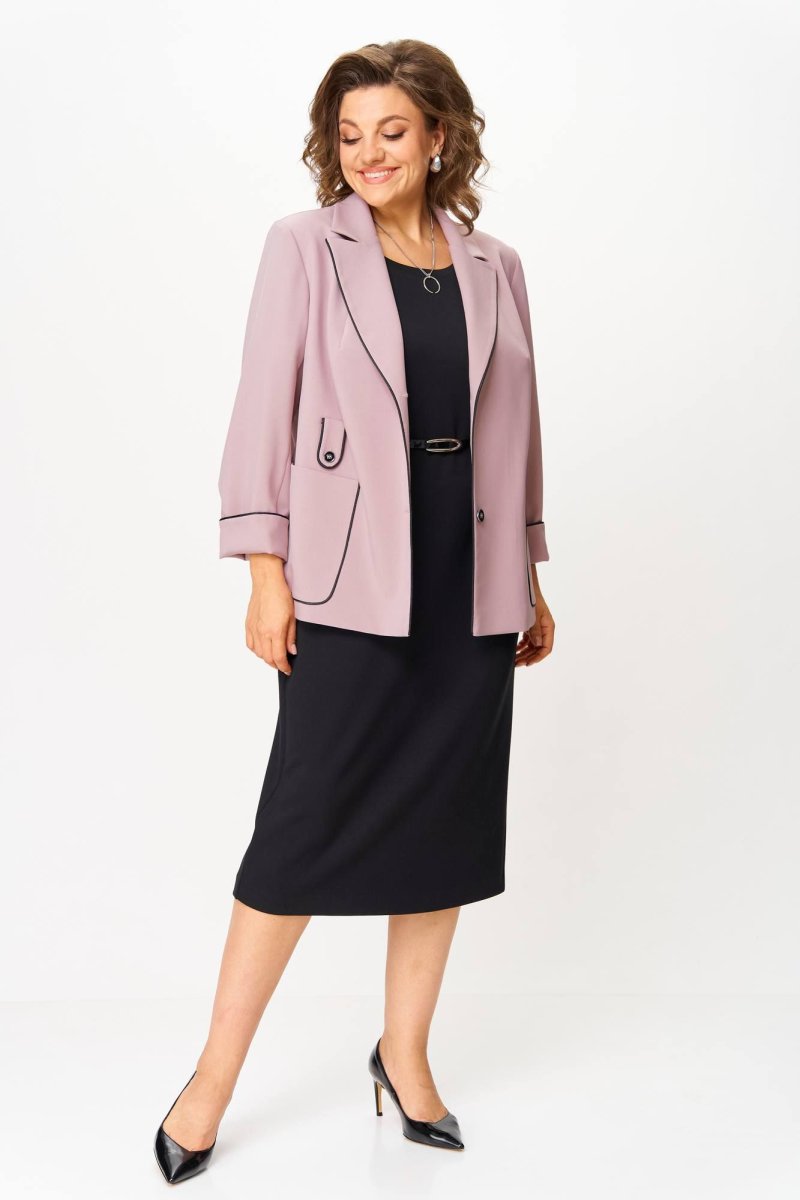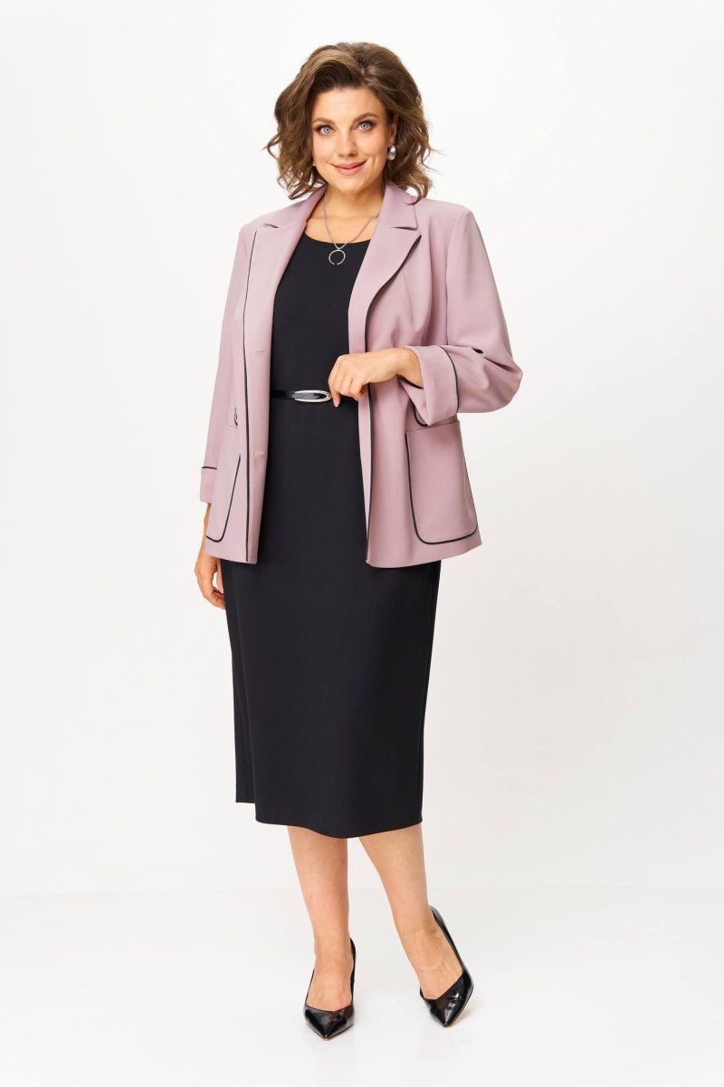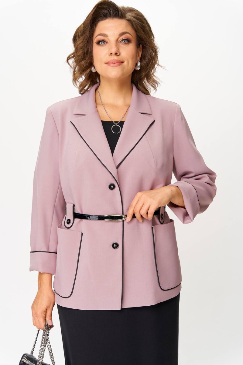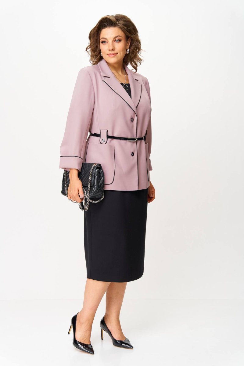 Жакет прямой, частично на подкладке (перед). Воротник пиджачный, частично вставлен кант. Застёжка центральная на 3 петли и пуговицы. По переду 2 накладных кармана, шлёвки, декорированных кантом. Рукав втачной двушовный, с отложной манжетой с кантом. Спинка со средним швом, рельефами. Пояс в комплекте.