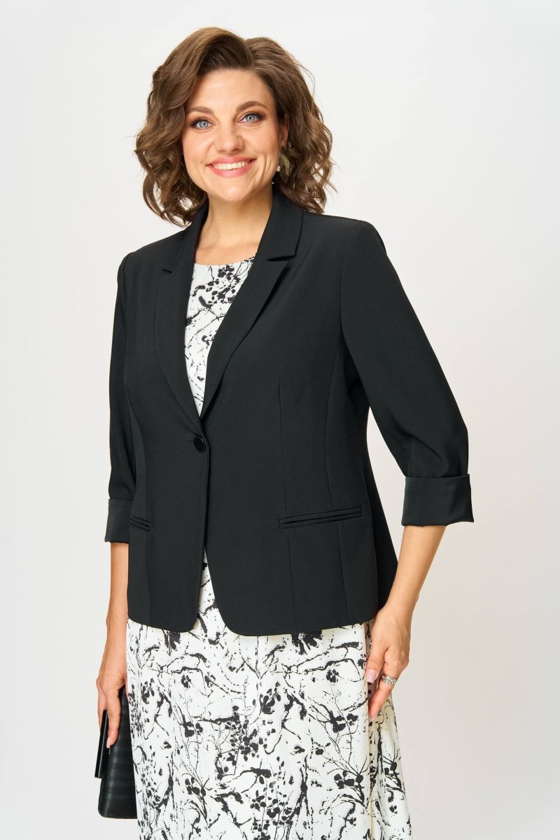 Жакет классический, полуприталенный. По переду 2 кармана в рамку. Воротник пиджачный. Застёжка центральная на 1 петлю и пуговицу. Рукав втачной, с отложной манжетой обработанной отделочной тканью. Спинка со средним швом, талиевые выточки. Жакет частично на подкладке ( перед).