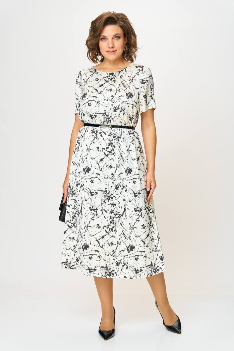 Платье выполнено из плательной ткани с атласной матовой поверхностью с абстрактным принтом. Силуэт платья расширенн к низу.