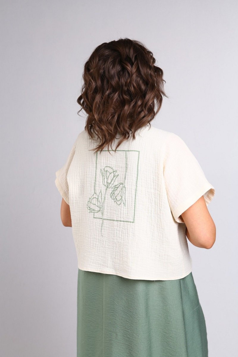 Рубашка прямого силуэта, укороченная. Застежка центральная на петли и пуговицы. Плечо приспущено, рукав летучая мышь.