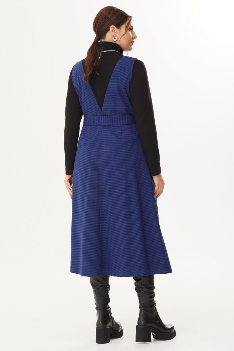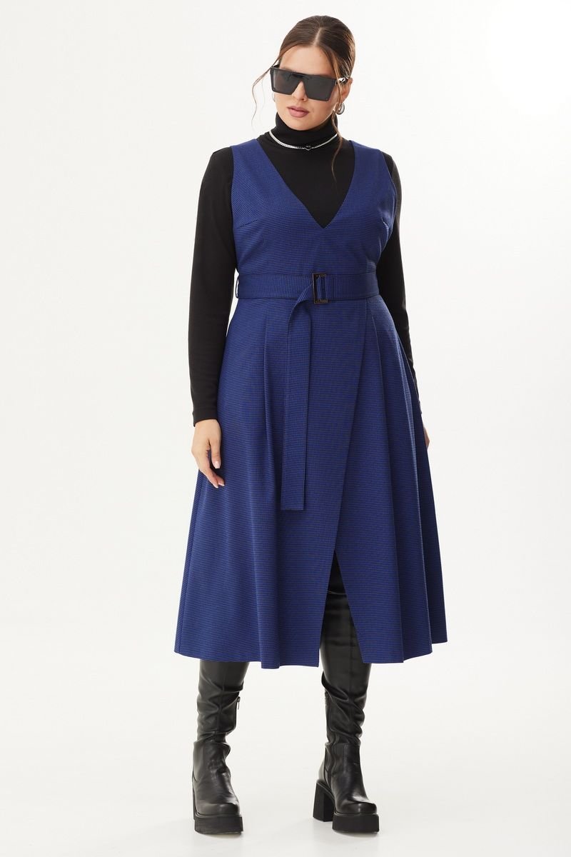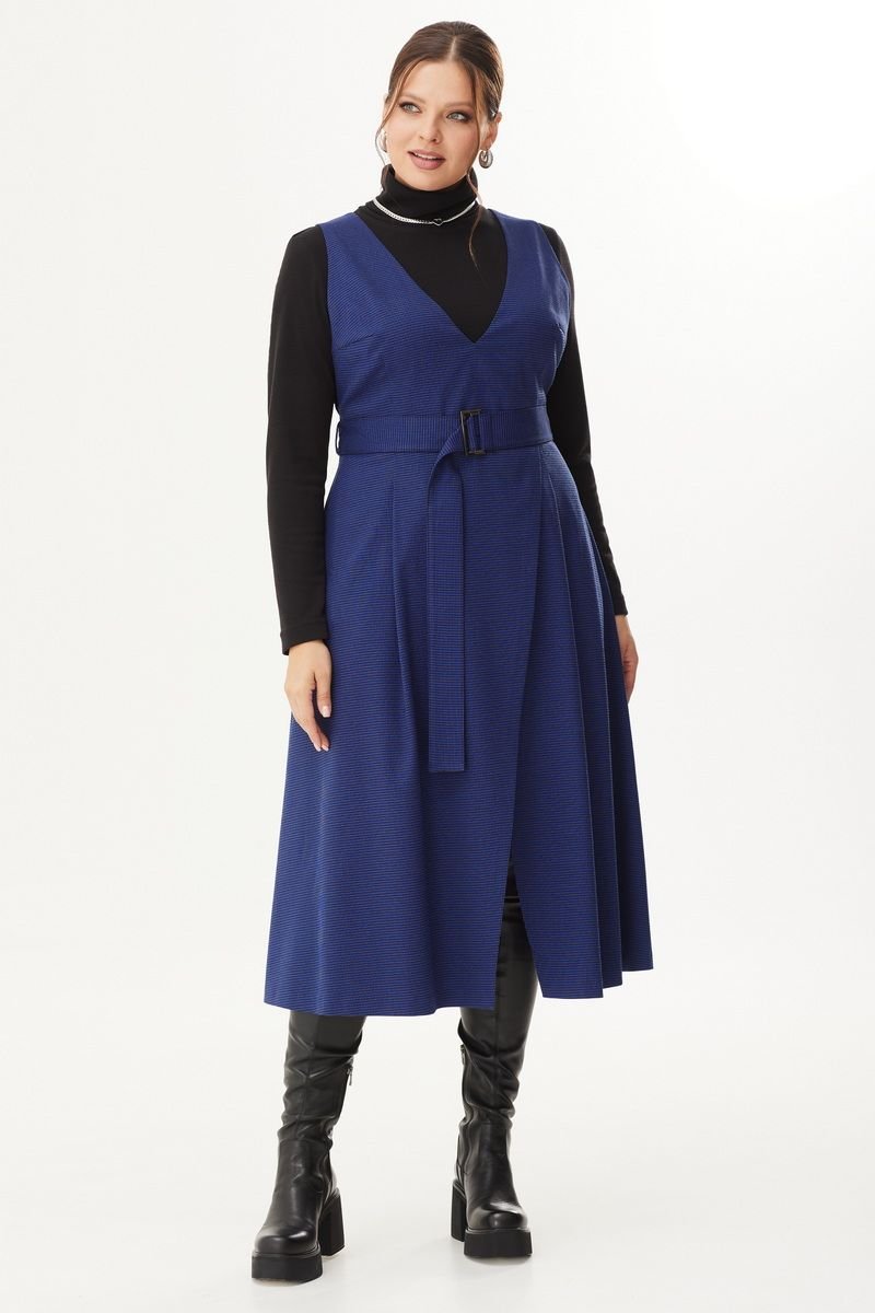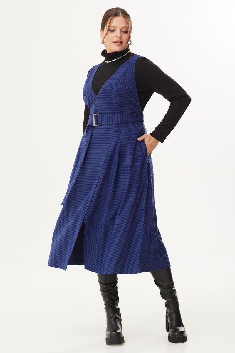 Стильный и элегантный комплект из водолазки и сарафана. Водолазка выполнена из мягкого и нежного фактурного трикотажного полотна "лапша". Сарафан полуприлегающего силуэта с эффектом запаха. Выполнен из мягкой костюмной ткани. Застежка по спинке на потайную молнию. Дополнен съемным поясом, выполненным из основной ткани. Длина водолазки от плечевого шва 63 см. Длина рукава 59см. Длина сарафана от плечевого шва 122см.