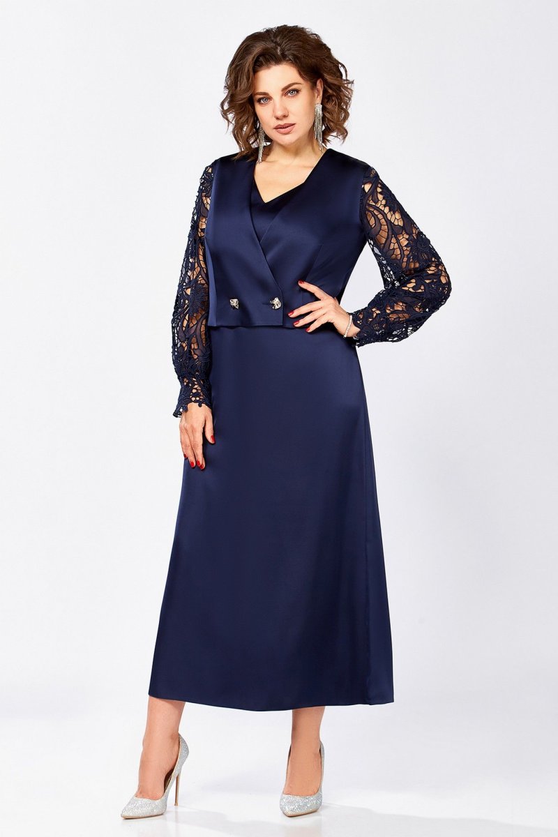 Нарядный комплект, состоит из платья и жакета, выполненных из атласа и кружева. Платье полу-прилегающего силуэта, выполнено из атласа, горловина V-образной формы, на обтачке. На полочке выполнены нагрудные вытачки, спинка со средним швом и вытачками, в среднем шве потайная молния. Жакет выполнен из атласа и кружева. Горловина V-образной формы, застежка двубортная, на петли-пуговицы, также на полочке обработаны вытачки. Спинка из атласа, со средним швом и вытачками, полочка и спинка на подкладке. Рукав втачной, из кружева, по низу присборен на резинку. Эффектный и стильный комплект отличный выбор для идеального образа!