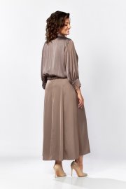 Женский комплект, состоит из платья и блузы, выполнен из однотонного атласа и атласа в полоску. Платье с V-образной горловиной, на обтачке, по переду обработаны нагрудные вытачки. Спинка со средним швом и вытачками, рукав цельнокроеный, немного спущенный по линии плеча. Блуза свободного покроя, из атласа в полоску, по линии талии с притачным поясом из атласа в полоску. По спинке в пояс вставлена резинка для удобства регулировки на любой тип фигуры, горловина на обтачке, обработана воротником. Лиф платья с кокеткой по линии плеча, от линии кокетки заложены складки, по низу лиф присборен на пос. Спинка также свободного покроя, присборена по низу на пояс. Рукав втачной, длиной 3/4, по низу присборен на широкий манжет, на манжете застежка на петлю-пуговицу. Эффектный и стильный комплект выполненный в трендовых расцветках сделает ваш образ элегантным на любом мероприятии!