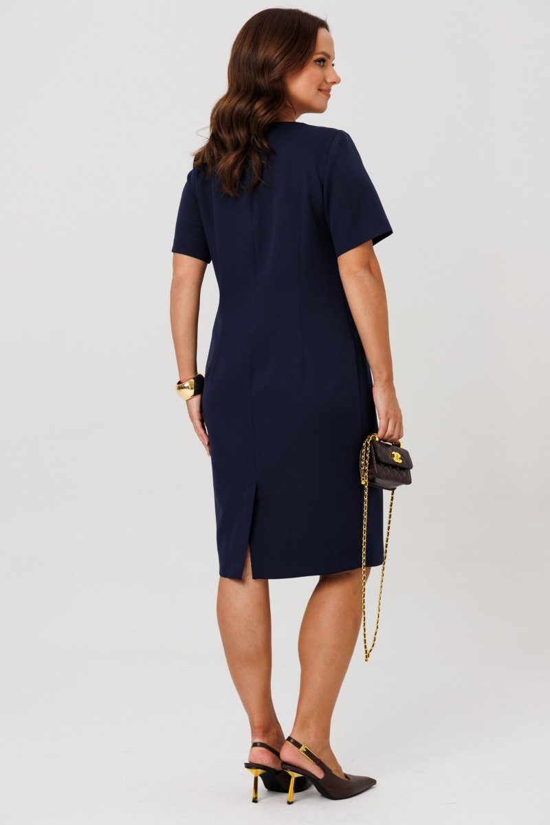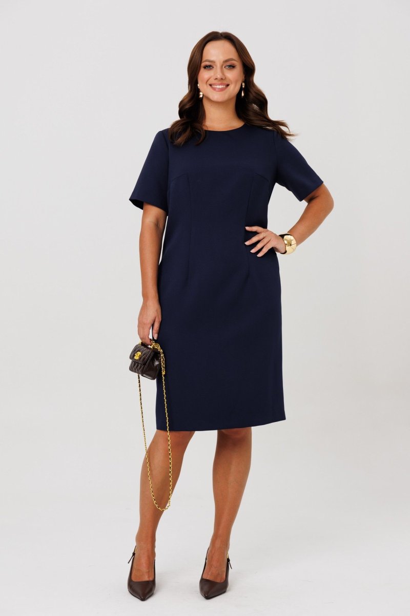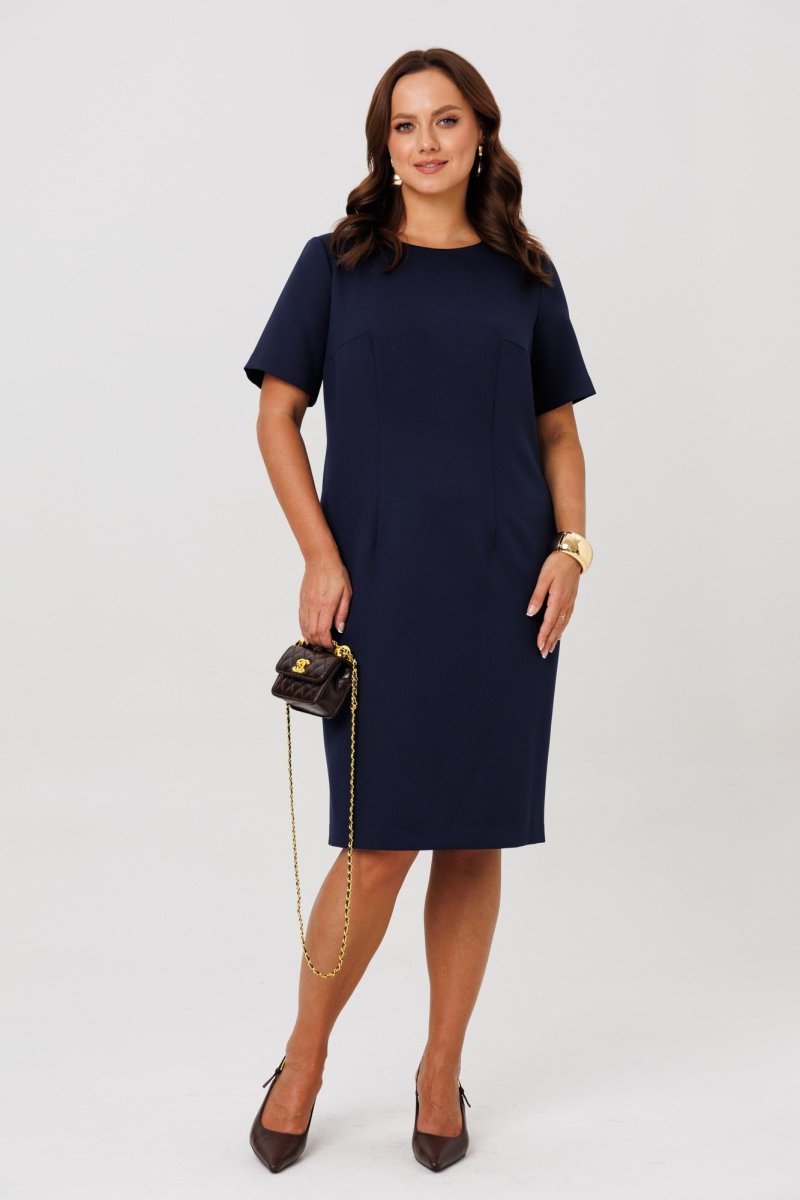 Платье из костюмно-плательной ткани (чуть тянется) полуприлегающего силуэта без подкладки, по переду нагрудные и талиевые вытачки. Спинка со средним швом и шлицей, застежкой – молнией и талиевыми вытачками, рукава втачные, одношовные. Горловина оформлена вырезом округлой формы.