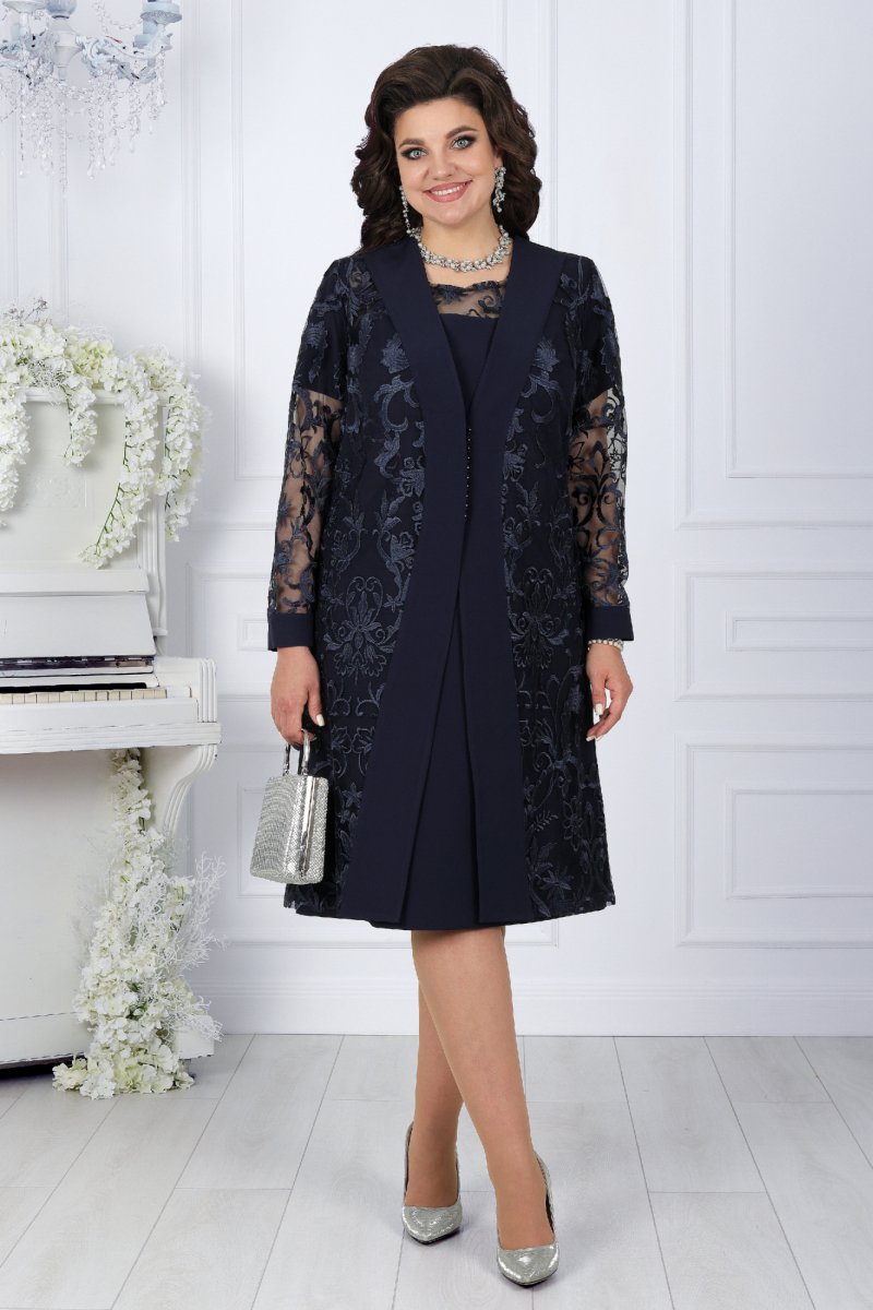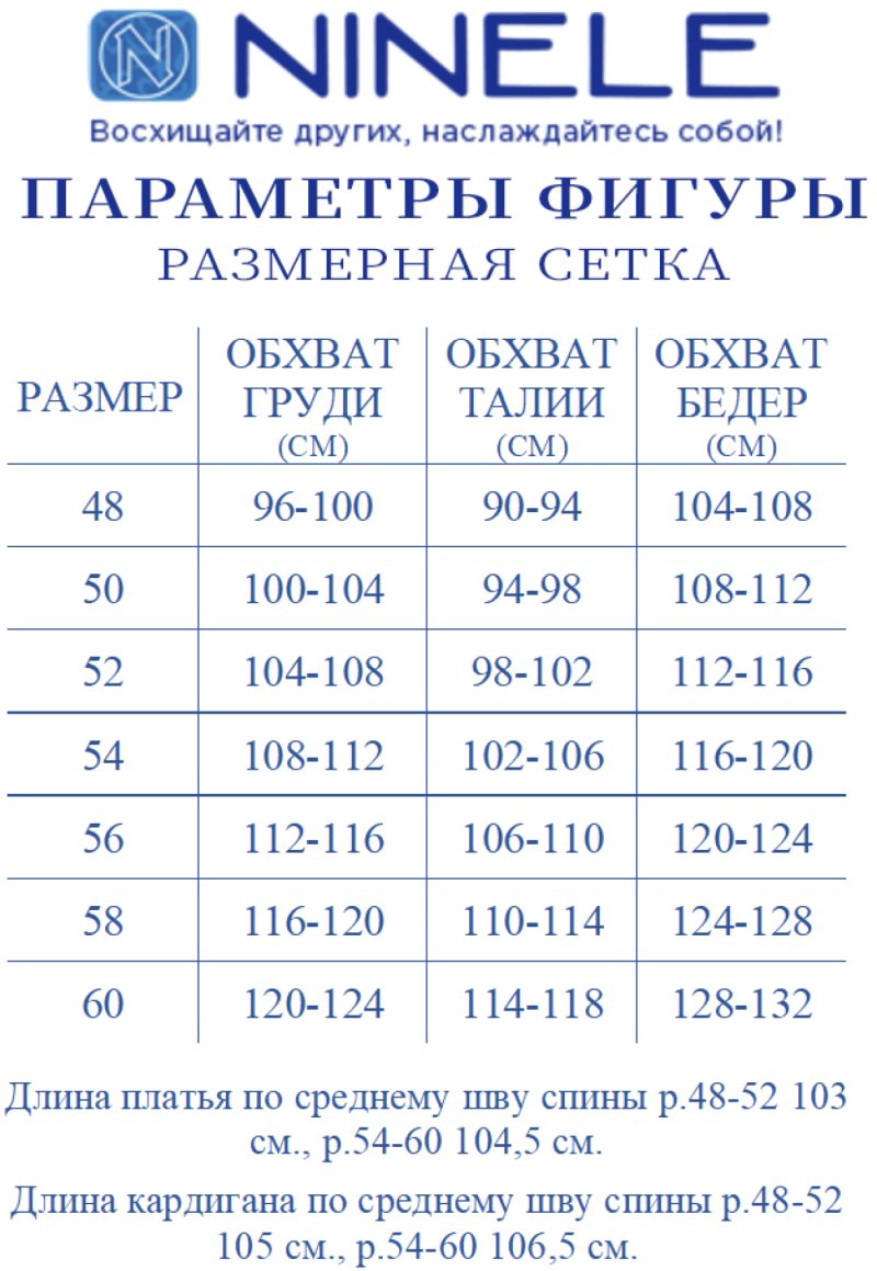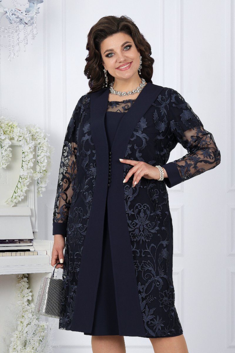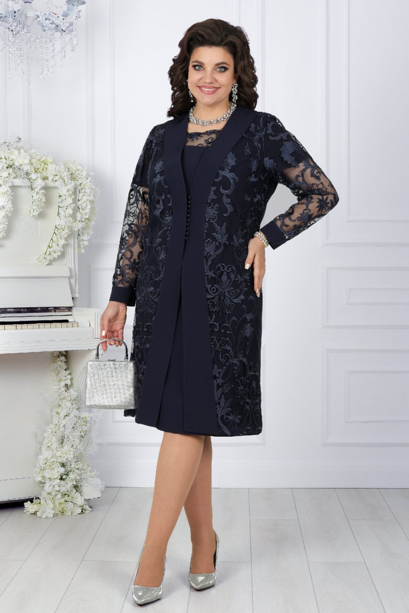Представляем вашему вниманию вечерний женский костюм от NINELE - истинное воплощение изящества. Этот наряд собрал в себе лучшие модные свадебные тенденции: сочетание костюмной ткани с изысканным кружевом придает образу особую изысканность и стиль. Костюм идеально подойдет для свадебного торжества, вечернего мероприятия или другого особого случая, где вы захотите выглядеть неповторимо и элегантно. Особенностью данного костюма является кружевной кардиган, выполненный из кружева и основной ткани. Такой дизайн элегантно формирует правильный силуэт фигуры, подчеркивая ее достоинства. Комплект женский, 2-х предметный, состоящий из платья и кардигана, выполненных из костюмно-плательной ткани в сочетании с гипюром. Платье женское полуприлегающего силуэта, расширенное к низу, длиной по среднему шву спинки 103 см. Перед с фигурной кокеткой из гипюра, идущей от середины левого плеча и уходящей в правую пройму, с декоративной деталью по правой стороне, идущей от кокетки вниз до линии талии. Длина платья - 103 см. (48-52 р-р.), 104,5 см (54-60 р-р.).Декоративная деталь 2-х слойная: верхний слой из гипюра, нижний из трикотажной подкладки. Перед с нагрудными вытачками, идущими: левая- из проймы, правая от декоративной детали. Спинка с талиевыми вытачками, со средним швом, в верхней части которого обработана застежка на потайную тесьму-«молния». Горловина спинки округлая, обтачная. Горловина переда округлая, углубленная, срез обработан на плоскошовной машине. Рукава втачные, одношовные. Длина рукавов 21 см. Длина кардигана - 105 см. (48-52 р-р.), 106,5 см. (54-60 р-р).