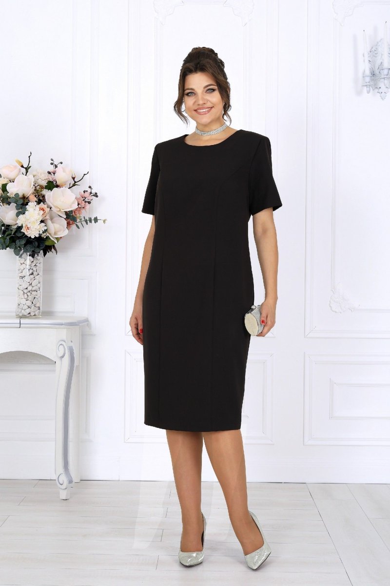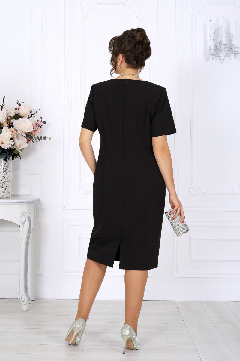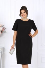 Платье полуприлегающего силуэта, выполнено из костюмно-плательной ткани. Модель на трикотажной подкладке, с плечевыми накладками. Перед и спинка с рельефными швами, направленными от проймы до низа. В верхней части среднего шва спинки обработана застежка на потайную тесьму-«молнию» (50см); в нижней части шва – шлица. Горловина округлой формы, спереди углубленная. Рукав втачной, короткий. Длина платья – 104 см; длина рукава – 25 см.