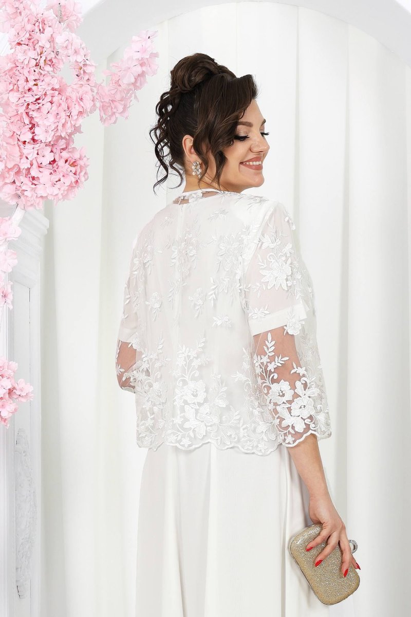 Жакет полуприлегающего силуэта, укороченный, выполнен из гипюра. Модель без подкладки. Перед с нагрудными вытачками, направленными от пройм. Срезы борта и горловины окантованы косой бейкой из плательного стрейч-шифона. Рукав втачной, длиной ¾. Низ переда, спинки и рукавов оформлен фестонами. Длина жакета – 52 см; длина рукава – 48 см.