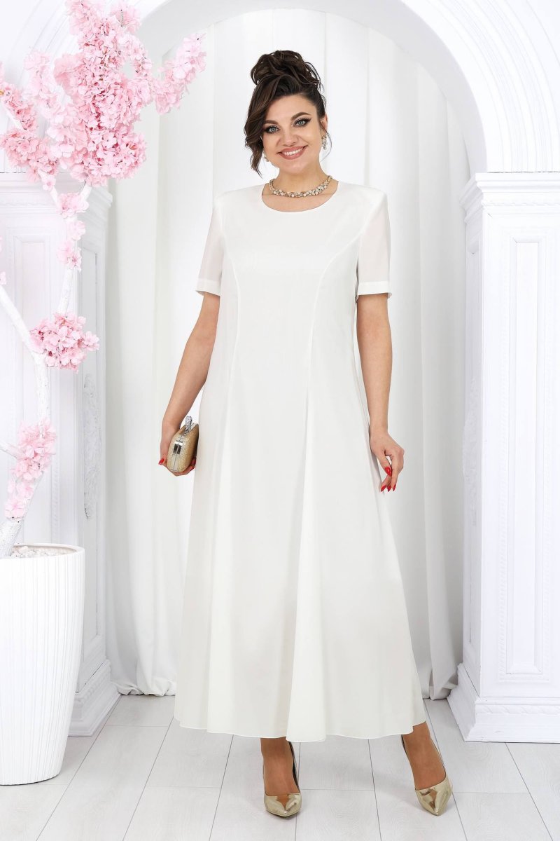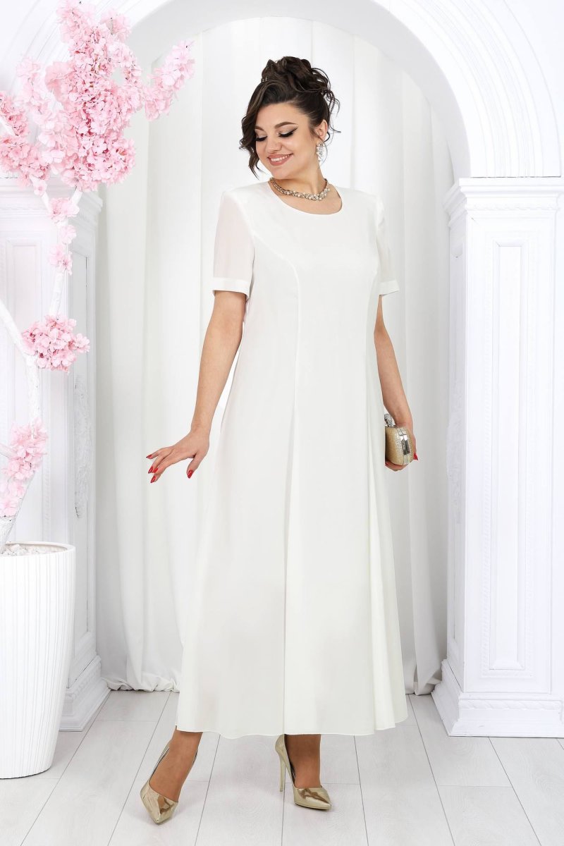 Платье полуприлегающего силуэта, расклешенное к низу. Модель двухслойная, оба слоя выполнены из плательного стрейч-шифона и скреплены по горловине и проймам. Перед с рельефными швами, проходящими через центр груди, идущими от пройм до низа. Спинка с рельефными швами, идущими от пройм до низа; в среднем шве обработана застежка на потайную тесьму-«молнию» (50 см). Горловина округлой формы, углубленная спереди. Рукав втачной, короткий. Платье с плечевыми накладками. Длина платья – 131 см, длина рукава – 25 см.