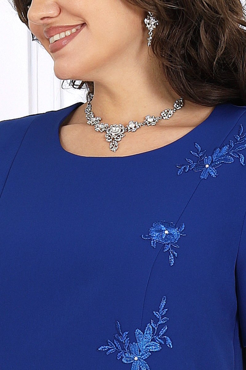 Платье женское, полуприлегающего силуэта, выполнено из костюмно-плательной ткани. Модель на трикотажной подкладке. С плечевыми накладками. Перед с рельефами, направленными от плечевых швов; в нижней части левого рельефного шва обработан разрез, по шву настрочена аппликация, дополненная перламутровыми бусинами. Спинка с рельефами, направленными от плечевых швов; в верхней части среднего шва обработана застежка на потайную тесьму-«молнию» (50см). Горловина круглой формы, углубленная спереди. Рукав втачной, короткий. Длина платья – 104 см; длина рукава – 23 см.