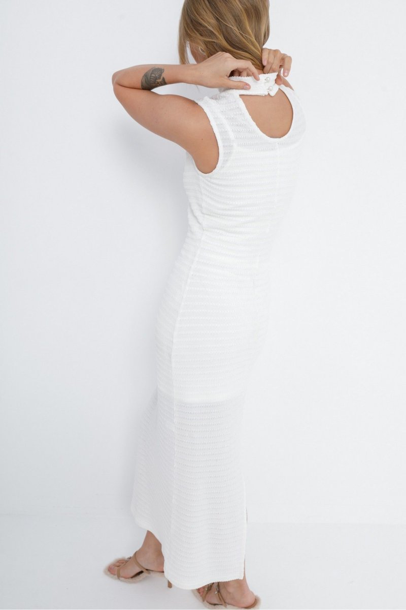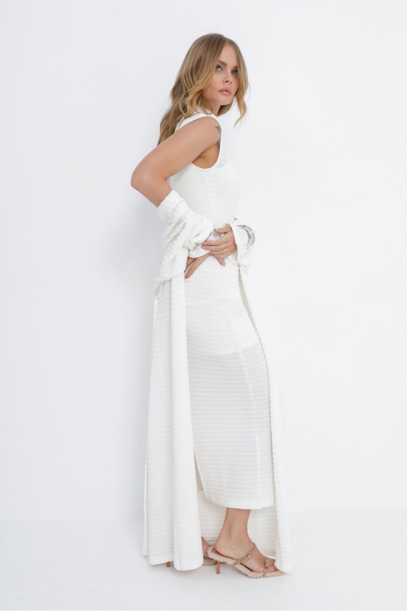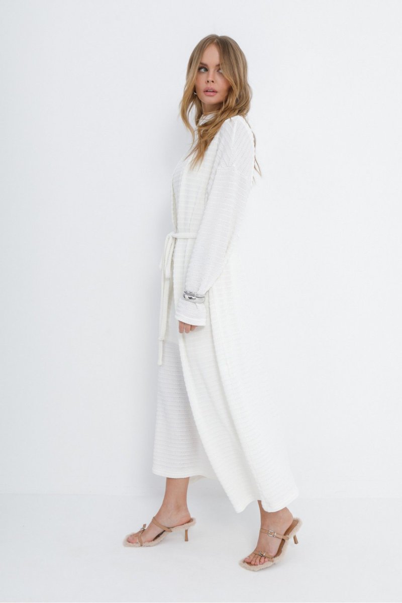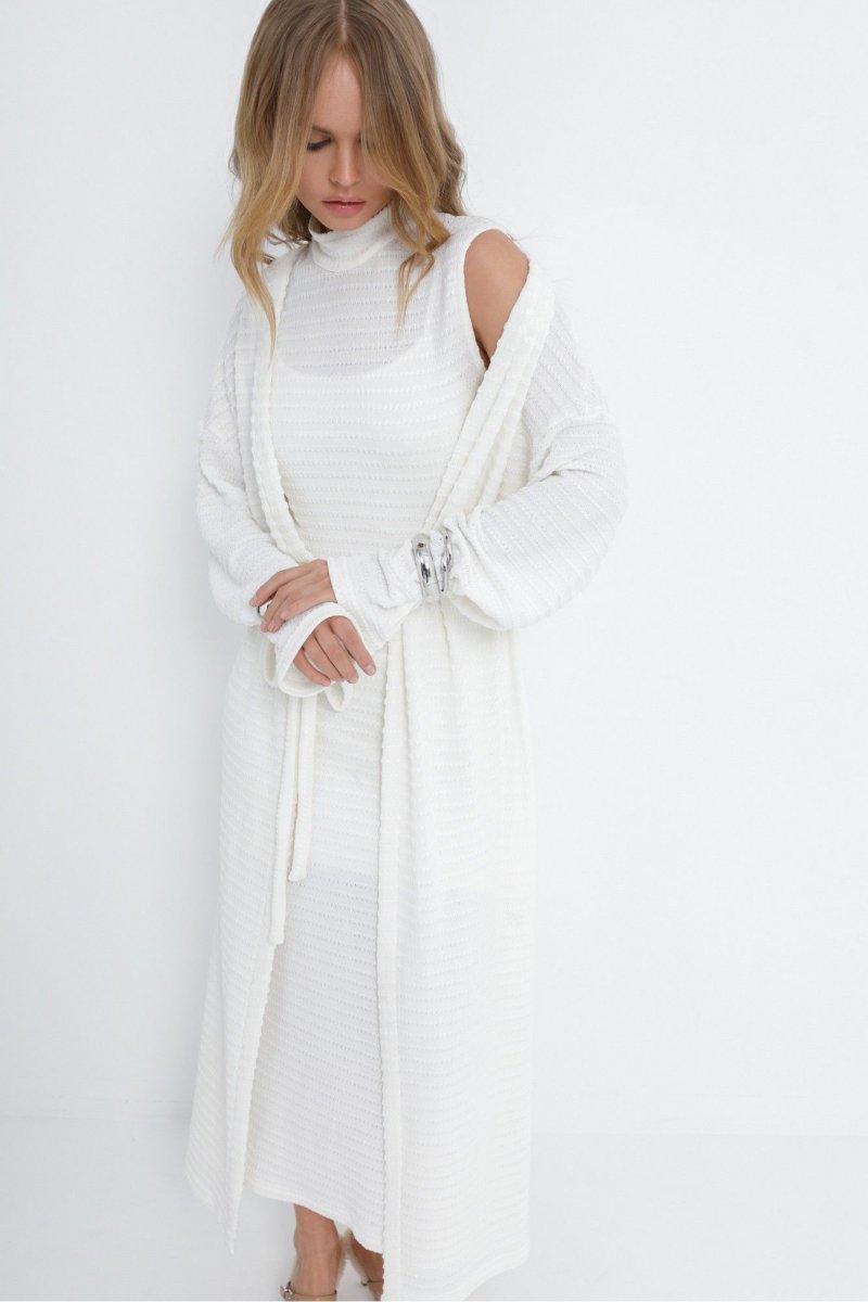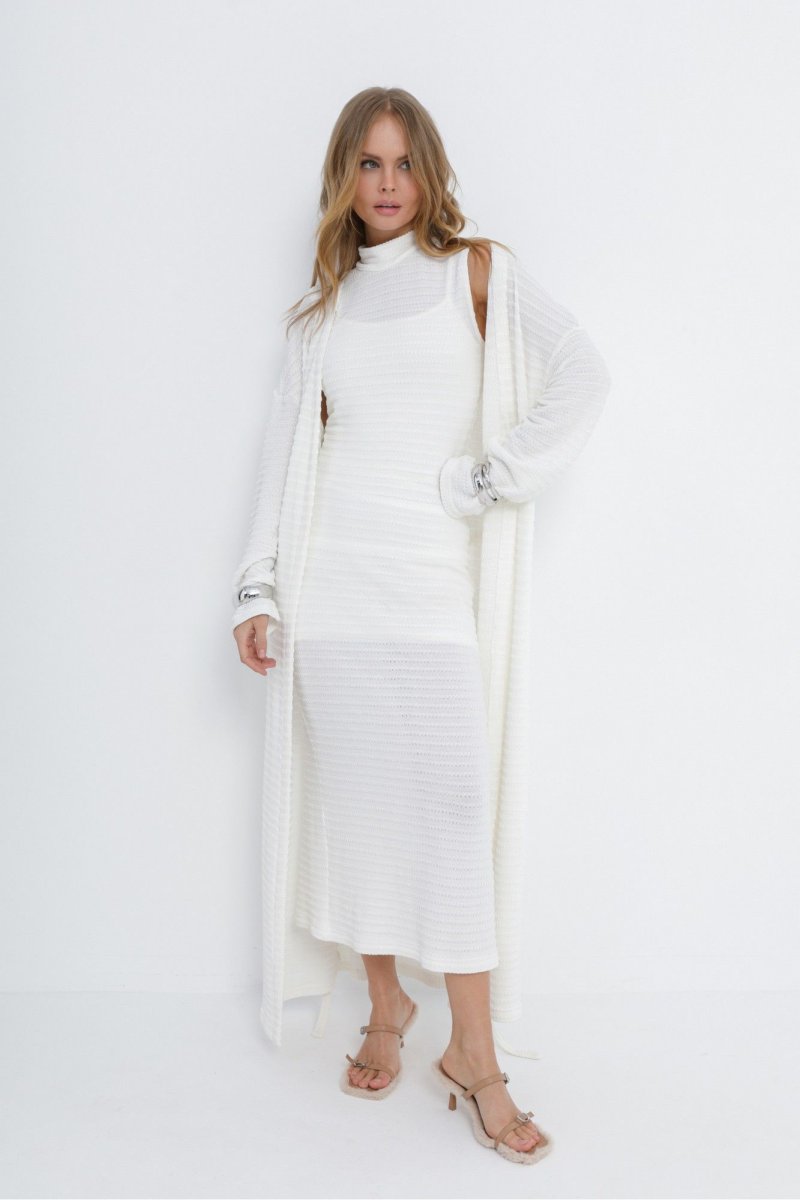 Комплект-тройка из ажурного макси-платья, свободного кардигана с поясом и облегающего мини-платья на бретелях.
