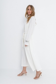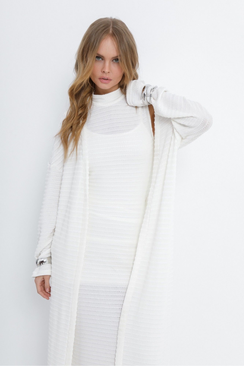 Комплект-тройка из ажурного макси-платья, свободного кардигана с поясом и облегающего мини-платья на бретелях. Детали: верхнее платье прилегающего силуэта, воротник-стойка с застежкой на навесные петли и пуговицы, фигурный вырез спинки, платье без подкладки. Нижнее мини-платье с глубоким вырезом и сборкой по бокам в районе талии. Кардиган свободного покроя со спущенной линией плеч, длинные рукава, съемный пояс. Длина макси-платья от верхней плечевой точки около 126 см* . Длина мини-платья по боку около 60 в размерах 40-46 и около 64 см в размерах 48-52. Длина кардигана по спинке около 122 см*