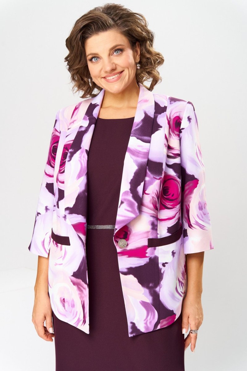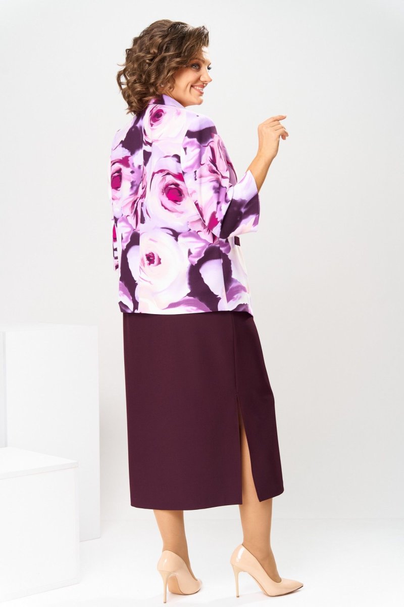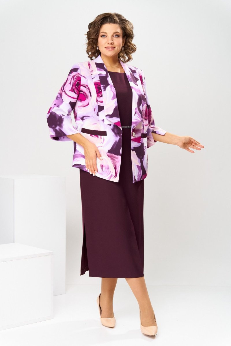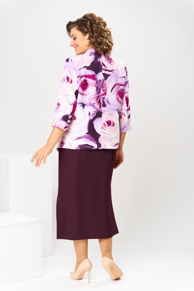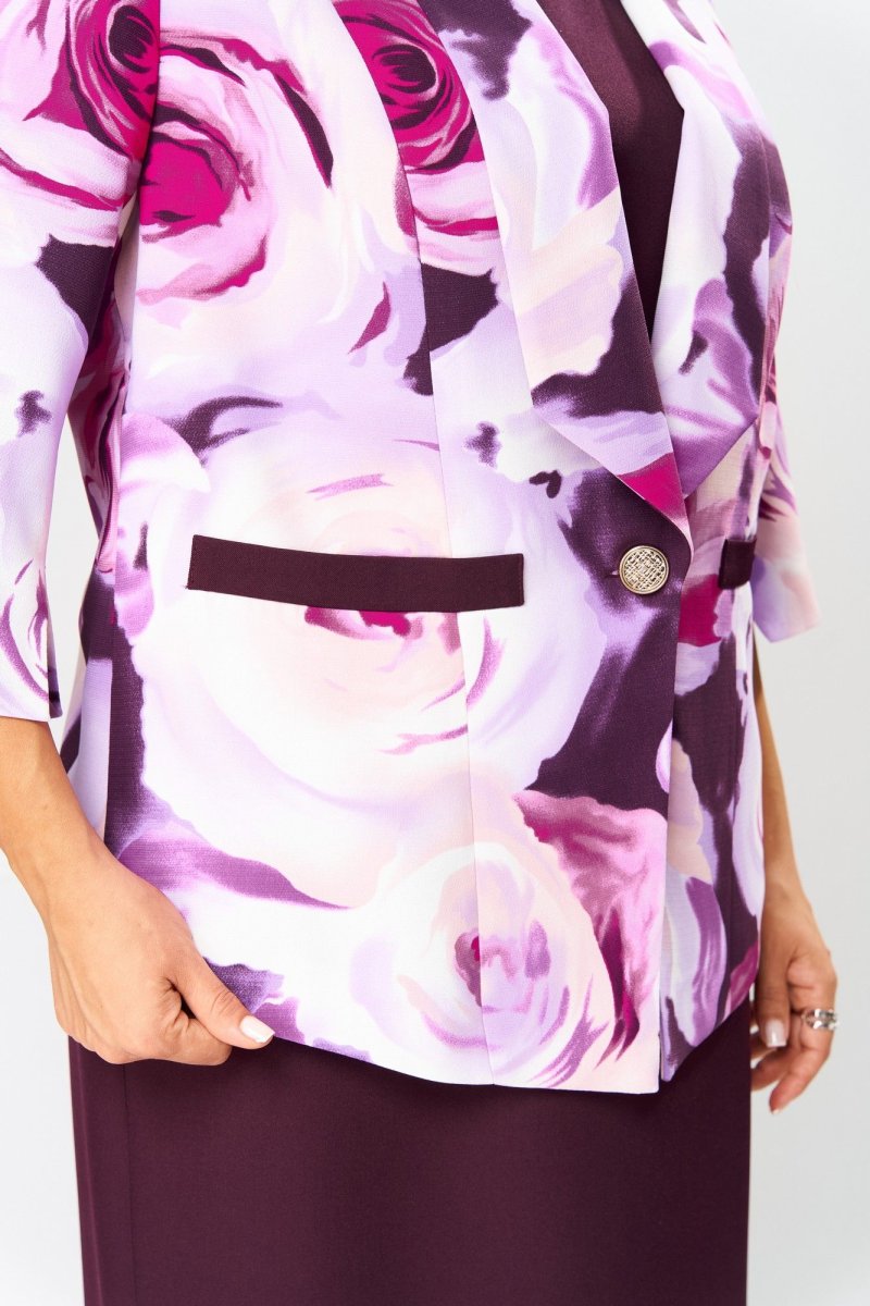 Комплект женский относится к торжественной нарядной одежде. Комплект женский 2-х предметный жакет и платье. Жакет полуприлегающего силуэта с фигурным низом, длиной до линии бёдер. Перед с 2-мя отрезными рельефами и 2-мя настрочными листочками на уровне линии талии. Спинка со средним швом. Горловина с V-образным вырезом с цельнокроеным воротником. Застёжка центральная бортовая на 1-ну петлю и 1-ну пришивную пуговицу. Рукав втачной, 2-х шовный, длиной 3/4, с разрезом внизу локтевого шва. Жакет на приточной подкладке. Жакет с плечевыми накладками. Платье женское полуприлегающего силуэта, длиной до середины икры. Платье отрезное по линии талии. Верхняя часть переда с 2-мя отрезными бочками; нижняя часть переда с 2-мя таллиевыми выточками. Шов соединения частей переда по линии талии декорирован термо тесьмой. Спинка верхняя часть с 2-мя таллиевыми вытачками; нижняя часть спинки с 2-мя таллиевыми вытачками. Боковые швы с разрезами. Горловина круглая обточная без воротника. Застёжка на потайную тесьму-молнию в левом боковом шве платья. Рукав втачной, короткий одношовный. Платье без плечевых накладок. Длина спинки жакета 64 см, длина рукава 45 см. Длина спинки платья 120 см, длина рукава 21 см