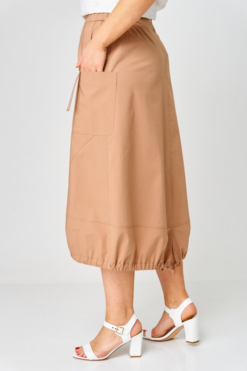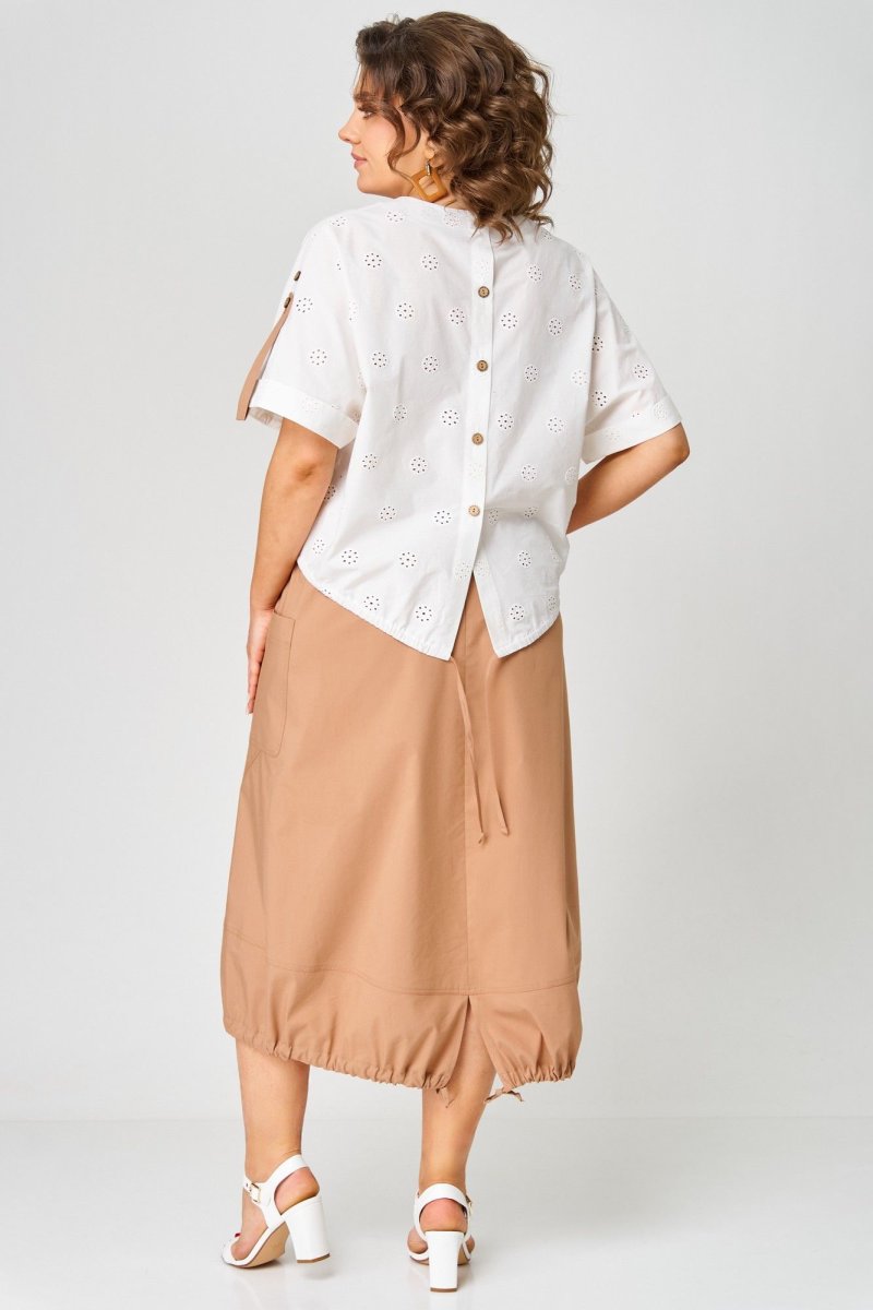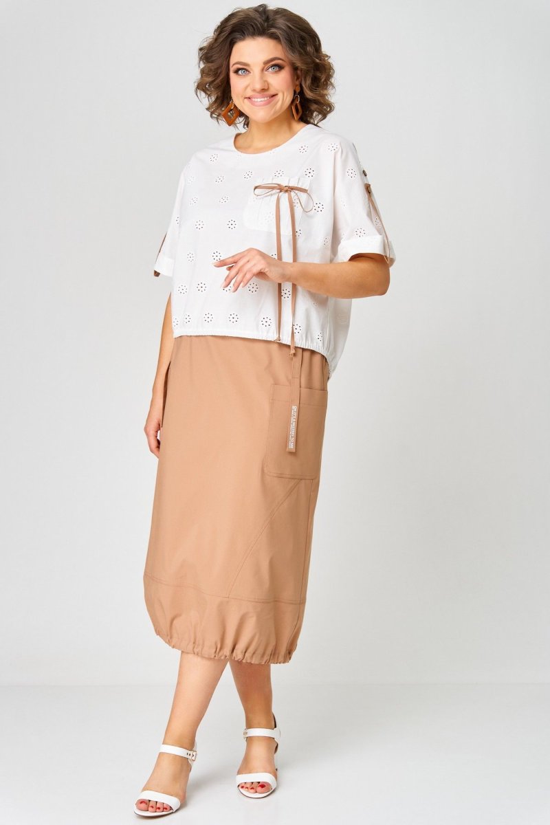 Костюм женский состоит из блузки и юбки. Блузка свободного силуэта с завязкой по низу. По переду накладной карман со съемной декоративной завязкой. По спинке застежкой на петли и пуговицы. Рукав цельнокроеный с манжетой по низу декорированный патой. Юбка "балон" с декоративными подрезами и кулисой по низу. По переделу накладные карманы декорированные патой. Застежка юбки на потайную молнию в среднем шве спинки, по низу разрез. ля максимально комфортной посадки по поясу вставлена эластичная резинка по бокам.