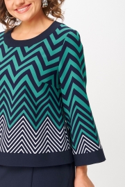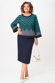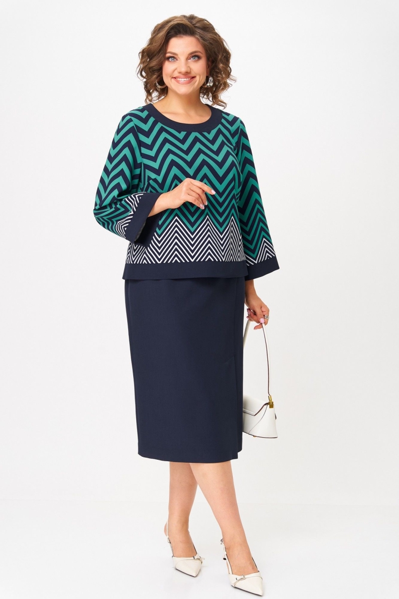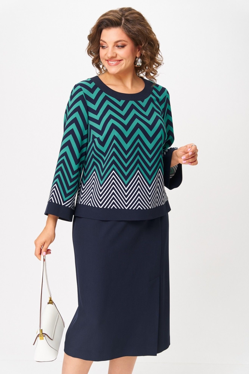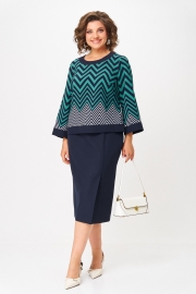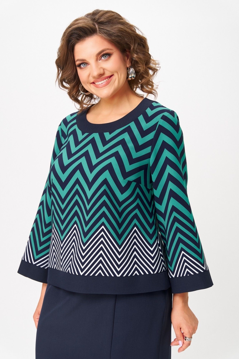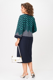 Стильный и гармоничный костюм состоит из блузки и юбки. Геометрический принт блузки притягивать к себе взгляд. Блузка прямого силуэта с нагрудными вытачками и декоративной отделкой по горловине, низу изделия и низу рукава. Рукав втачной одношовный. Спинка без особенностей. Юбка прямого силуэта со шлицей спереди по левой части. Пояс притачной с эластичной тесьмой по спинке, что обеспечивает максимально комфортную посадку на любой тип фигуры.