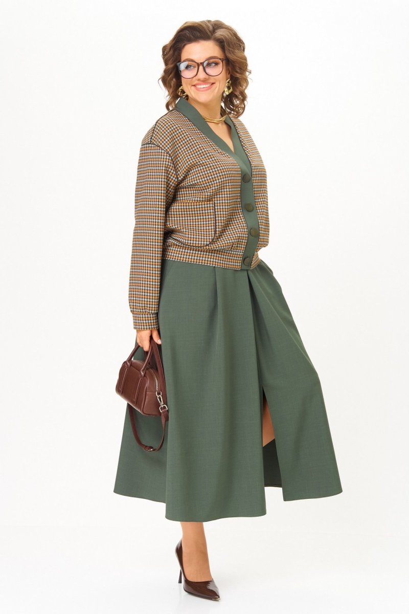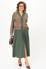 Этот костюм — воплощение интеллектуальной элегантности. Мягкий светло-серый кардиган с коричневыми кантами и крупными пуговицами создаёт образ уютного шарма. V-образный вырез визуально вытягивает шею, а контрастные детали подчёркивают чёткость линий. Рукав на спущенной плойме с манжетой по низу. По перду накладные карманы с декоративной нашивкой. Коричневая юбка миди с глубокими встречными складками и разрезом по переду добавляет образу женственности. В боковых швах карманы. Юбка на подкладке. Для максимально комфортной посадки по бокам пояса вставлена эластичная резинка. Сочетание мягкого верха и строгого низа создаёт баланс между комфортом и аккуратностью, делая комплект универсальным для офиса, повседневных выходов и стильных деловых встреч.