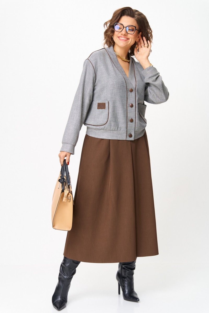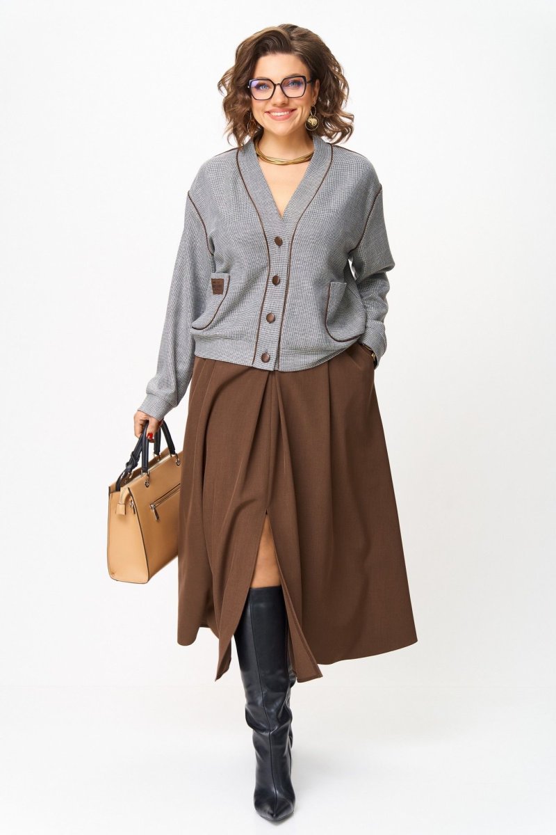 Этот костюм — воплощение интеллектуальной элегантности. Мягкий светло-серый кардиган с коричневыми кантами и крупными пуговицами создаёт образ уютного шарма. V-образный вырез визуально вытягивает шею, а контрастные детали подчёркивают чёткость линий. Рукав на спущенной плойме и манжетой по низу. По перду накладные карманы с декоративной нашивкой. Коричневая юбка миди с глубокими встречными складками и разрезом по переду добавляет образу женственности. В боковых швах карманы. Юбка на подкладке. Для максимально комфортной посадки по бокам пояса вставлена эластичная резинка. Сочетание мягкого верха и строгого низа создаёт баланс между комфортом и аккуратностью, делая комплект универсальным для офиса, повседневных выходов и стильных деловых встреч.