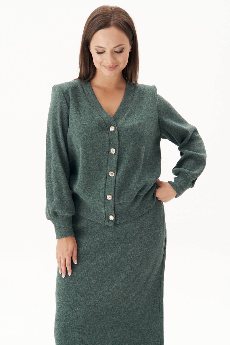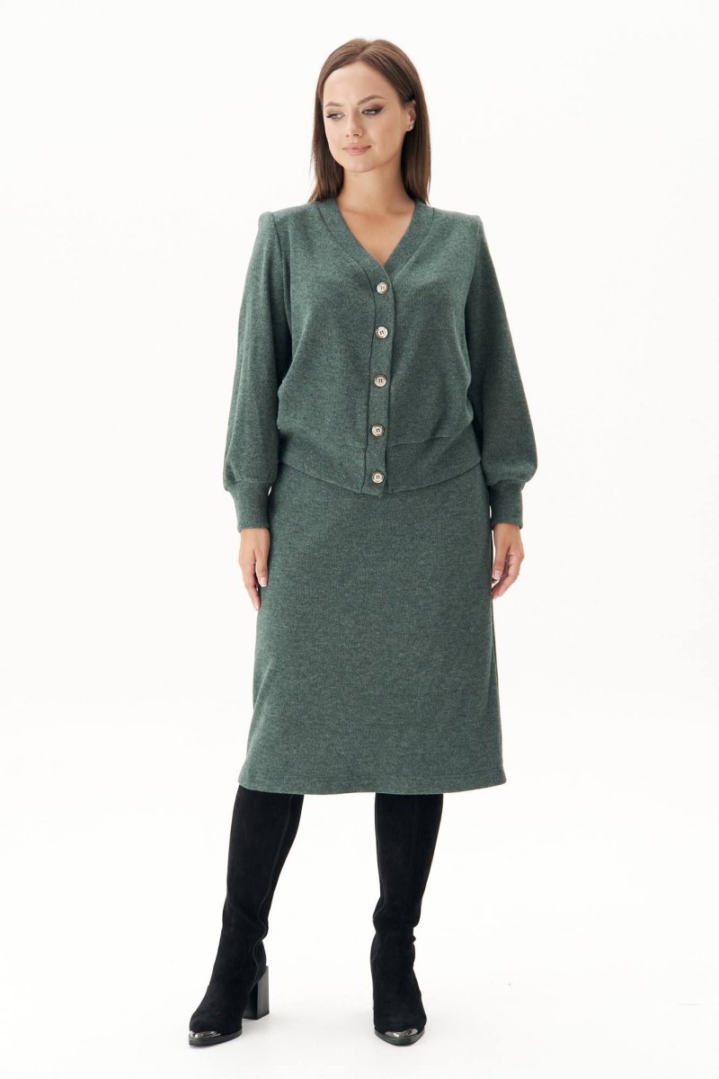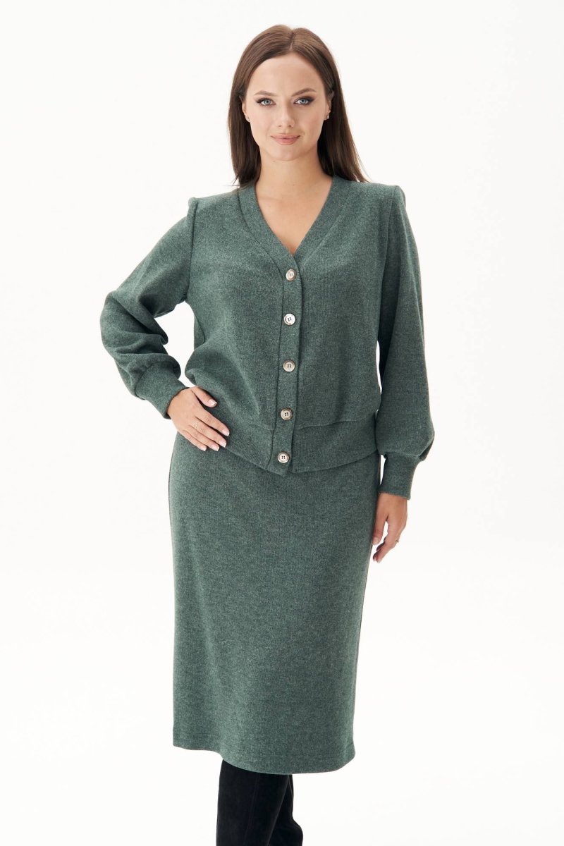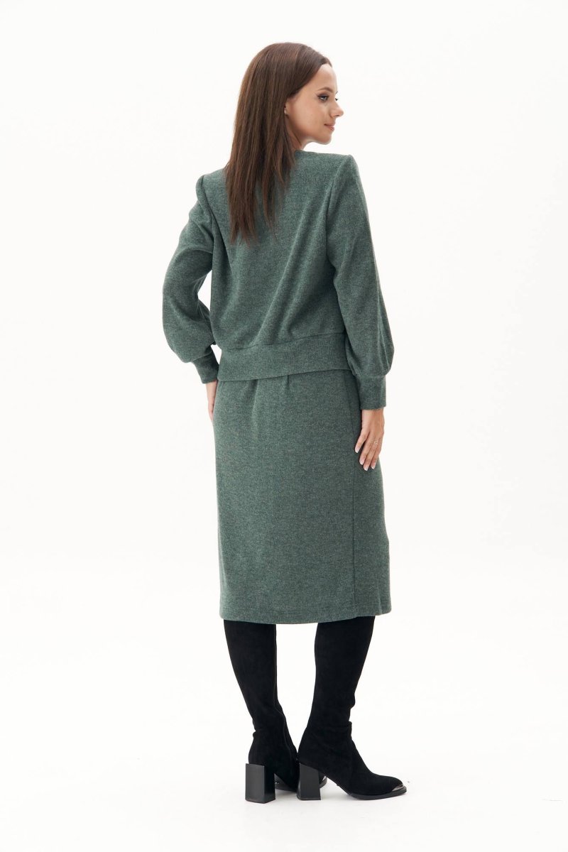 Модный гардероб современной женщины очень разнообразен, но есть ещё много крутых идей, как составить оригинальный уникальный образ. Среди таковых - трикотаж, ведь его легко трансформировать в разнообразные нескучные аутфиты. В качестве базы солирует модный трикотажный комплект с юбкой. Классическая юбка длины миди с молнией в боковом шве и эластичным поясом. Джемпер свободного силуэта, втачного покроя, с центральной застёжкой на притачной планке на петли и пуговицы. По низу джемпера и рукавов - притачные манжеты. Чёткая линия плеча достигается использованием плечевых накладок. Длина юбки около 70 см. Длина джемпер около 54 см. Длина рукава около 60 см.