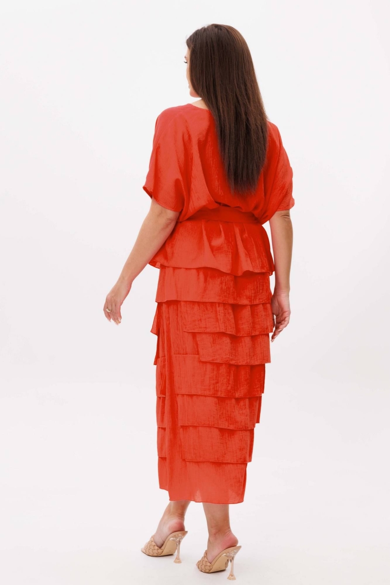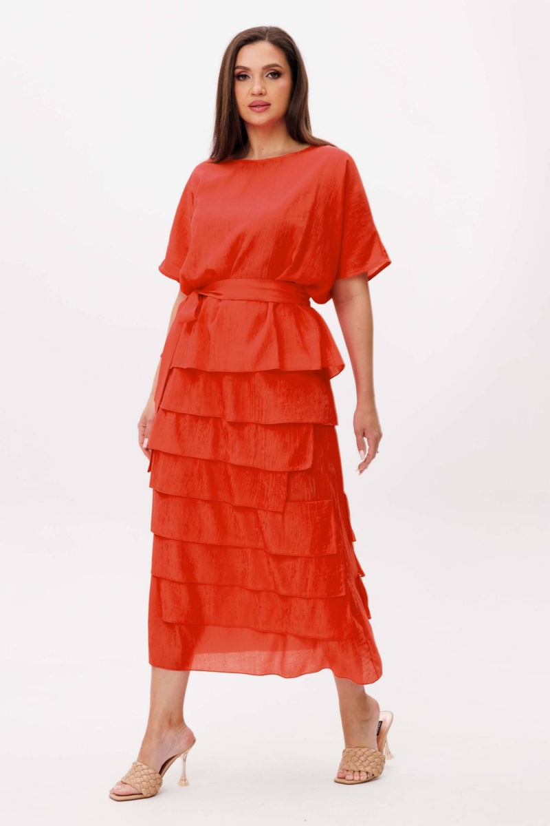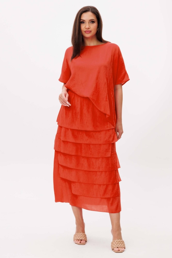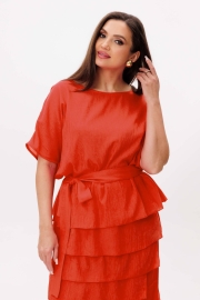 Казалось бы, лучшая одежда для тёплого лета - это платье, сшитое из лёгкой ткани, однако, по сравнению с платьем или сарафаном, комплект имеет преимущества, которые сложно оспорить. Во-первых, хорошая комбинаторность. Вы легко можете сочетать вещи комплекта с другими предметами гардероба - футболками, брюками, топами. Во-вторых, комплект умело скрывает недостатки телосложения, при этом подчёркивает женственность, являясь более практичной одеждой. Комплект состоит из свободной бузы и юбки. Блуза с расширенной линией горловины цельнокроенного покроя с коротким рукавом, широкая по форме с прямой линией низа. Юбка на широком притачном поясе с удобной эластичной лентой внутри и застёжкой на потайную тесьму - "молнию" сбоку. И поскольку многослойность сейчас в тренде - переднее с заднее полотнище юбки выполнено в виде настрочных асимметричных воланов без сборки - что даёт нужный правильный эффект без оптического увеличения объёмов. Комплект дополнен широким мягким поясом, который по Вашему желанию подчеркнёт линию талии. Длина блузы по спинке около 56 см, длина юбки около 89 см.