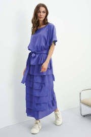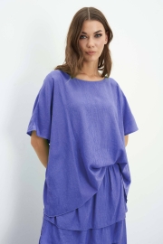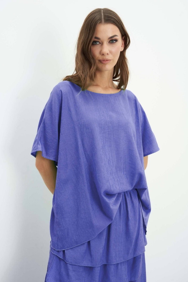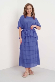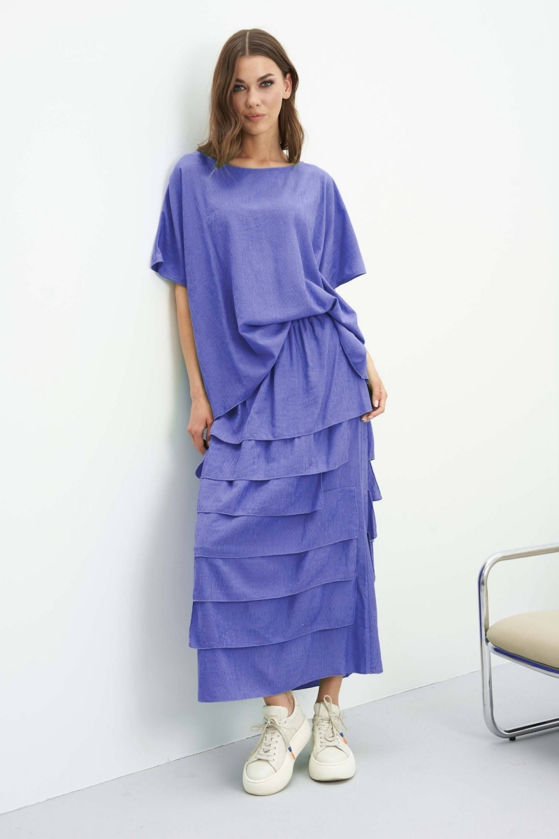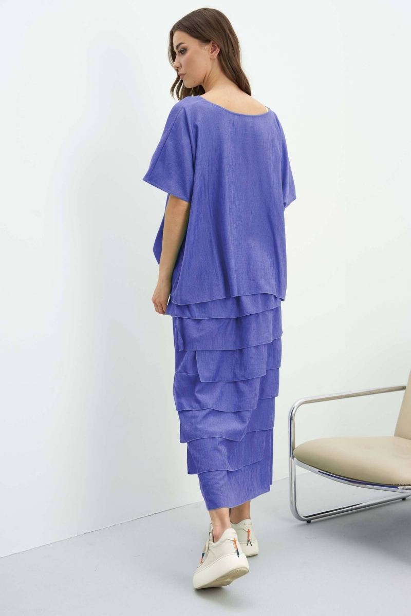 Казалось бы, лучшая одежда для тёплого лета - это платье, сшитое из лёгкой ткани, однако, по сравнению с платьем или сарафаном, комплект имеет преимущества, которые сложно оспорить. Во-первых, хорошая комбинаторность. Вы легко можете сочетать вещи комплекта с другими предметами гардероба - футболками, брюками, топами. Во-вторых, комплект умело скрывает недостатки телосложения, при этом подчёркивает женственность, являясь более практичной одеждой. Комплект состоит из свободной бузы и юбки. Блуза с расширенной линией горловины цельнокроенного покроя с коротким рукавом, широкая по форме с прямой линией низа. Юбка на широком притачном поясе с удобной эластичной лентой внутри и застёжкой на потайную тесьму - "молнию" сбоку. И поскольку многослойность сейчас в тренде - переднее с заднее полотнище юбки выполнено в виде настрочных асимметричных воланов без сборки - что даёт нужный правильный эффект без оптического увеличения объёмов. Комплект дополнен широким мягким поясом, который по Вашему желанию подчеркнёт линию талии. Длина блузы по спинке около 56 см, длина юбки около 89 см.