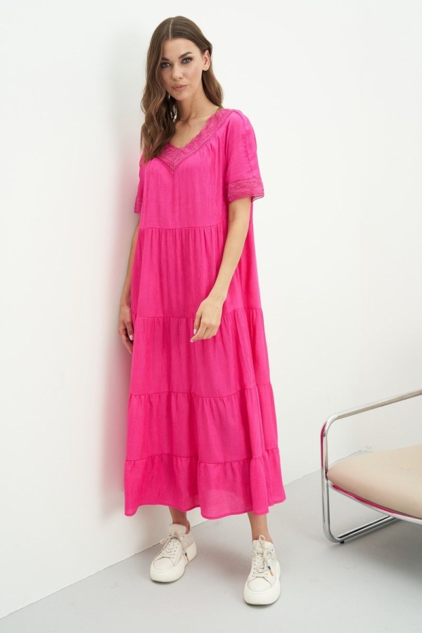 Летние платья - важный и неизменный атрибут атрибут сезона отпусков, жарких городских будней, романтических вечеров. Выбирая платье мы рекомендуем обратить внимание на лёгкие практичные ткани с эффектом жатого полотна и сделать ставку на цвет. Насыщенно яркий цвет, актуальные самые трендовые оттенки - в таком платье остаться незамеченный невозможно. Добавляем удобный вариант покроя реглан, свободную форму, длину в пол и получаем идеальное летнее платье. Платье с V-образным вырезом горловины, отрезное чуть выше линии талии, с коротким рукавом покроя-реглан имеет конструктивное решение в виде широких воланов с легкими сборками. В области груди-сборки вместо нагрудных выточек. По центру спинки также сборки с декоративной подвески у планки горловины. Горловина и низ рукавов обработаны полосами широкого полупрозрачного хлопкового кружева, окрашенного в тон основного цвета платья. Длина платья по спинке – ок 125 см Длина рукава с плечом-ок 36 см