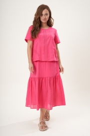 Самые популярные летние костюмы представлены в монохромном исполнении, где палитра и цветовое решение задаёт настроение и тон всему женскому образу. Не бойтесь выбирать сочные и такие необыкновенные оттенки, как фуксия, изумрудно-зелёный, насыщенный сине-голубой. Они сделают образ динамичным, экспрессивным и запоминающимся. Летний лёгкий костюм состоит из блузы и юбки, выполненный из хлопкового шитья в сочетании с однотонной тканью. Блуза упрямленного силуэта с круглым вырезом горловины и застёжкой на планке по центру спинки. Перед с вертикальными рельефами, что зрительно "вытягивает" фигуру. Боковые части переда и спинка с диагональным расположением рисунка в виде ажурных полос. Рукава втачные, короткие. Юбка длины миди на притачном поясе с эластичной лентой и застёжкой в боковом шве на потайную тесьму - "молнию". Широкий волан юбки ажурный с лёгкой сборкой по линии притачивания. Верхняя часть юбки - из однотонной ткани, непрозрачная, на подкладке. Длина блузы по спинке около 55 см. Длина рукава около 21 см. Длина юбки около 84 см.