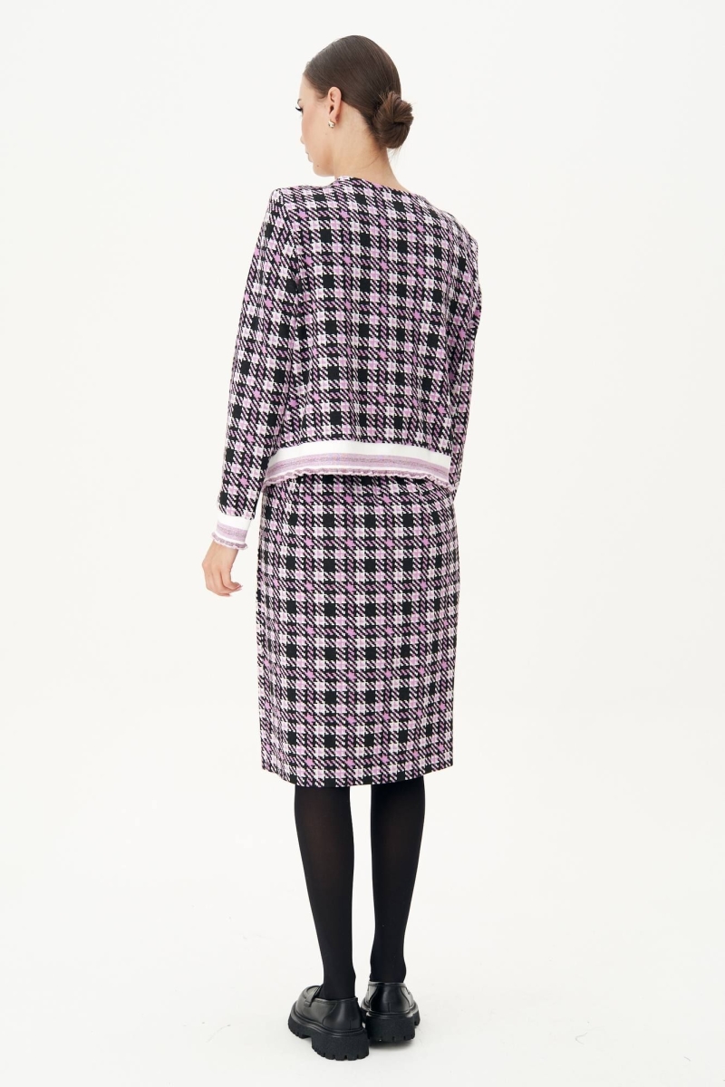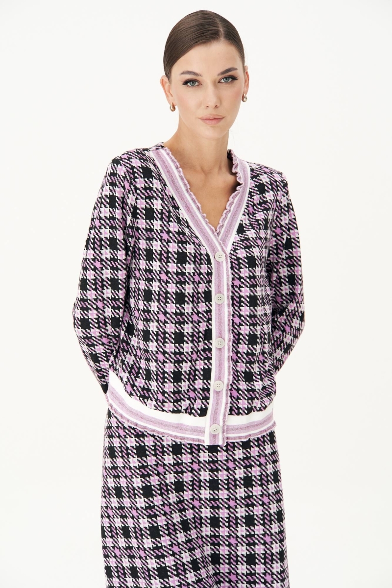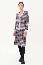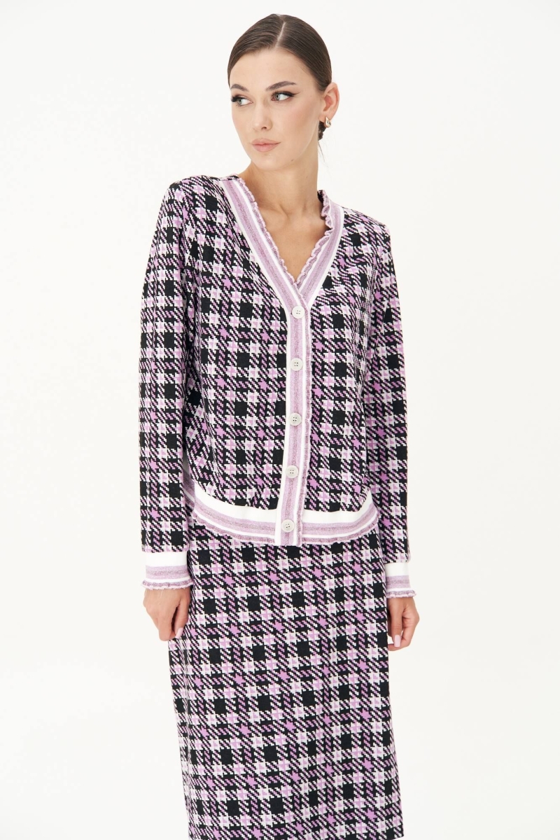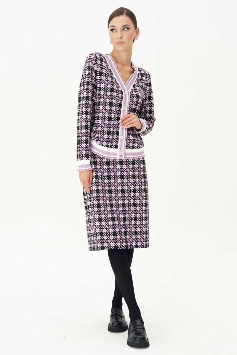 Модный трикотаж стал бесспорным "must have" в этом осеннем сезоне. Носить любимые и практичные трикотажные вещи теперь можно смело, не беспокоясь о модных тенденциях, а только соответствуя им. Практичность такого гардероба сложно переоценить, вещи из одного лука можно смело сочетать с другими вещами и при этом выглядеть супер современно. Комплект состоит из джемпера и юбки. Джемпер свободного силуэта с втачным рукавом. Застежка центральная на петли и пуговицы. По линии борта, низу изделия, рукавам и горловине - отделочная эластичная тесьма "довяз" с легким блеском. Юбка зауженная к низу, на притачном поясе с частично эластичными вставками в области боковых швов. Длина джемпера около 52 см. Длина рукава около 60 см. Длина юбки около 55 см.