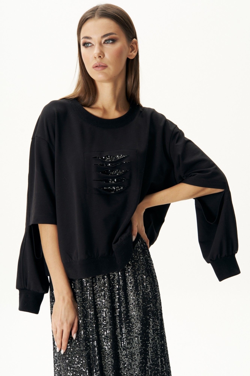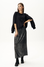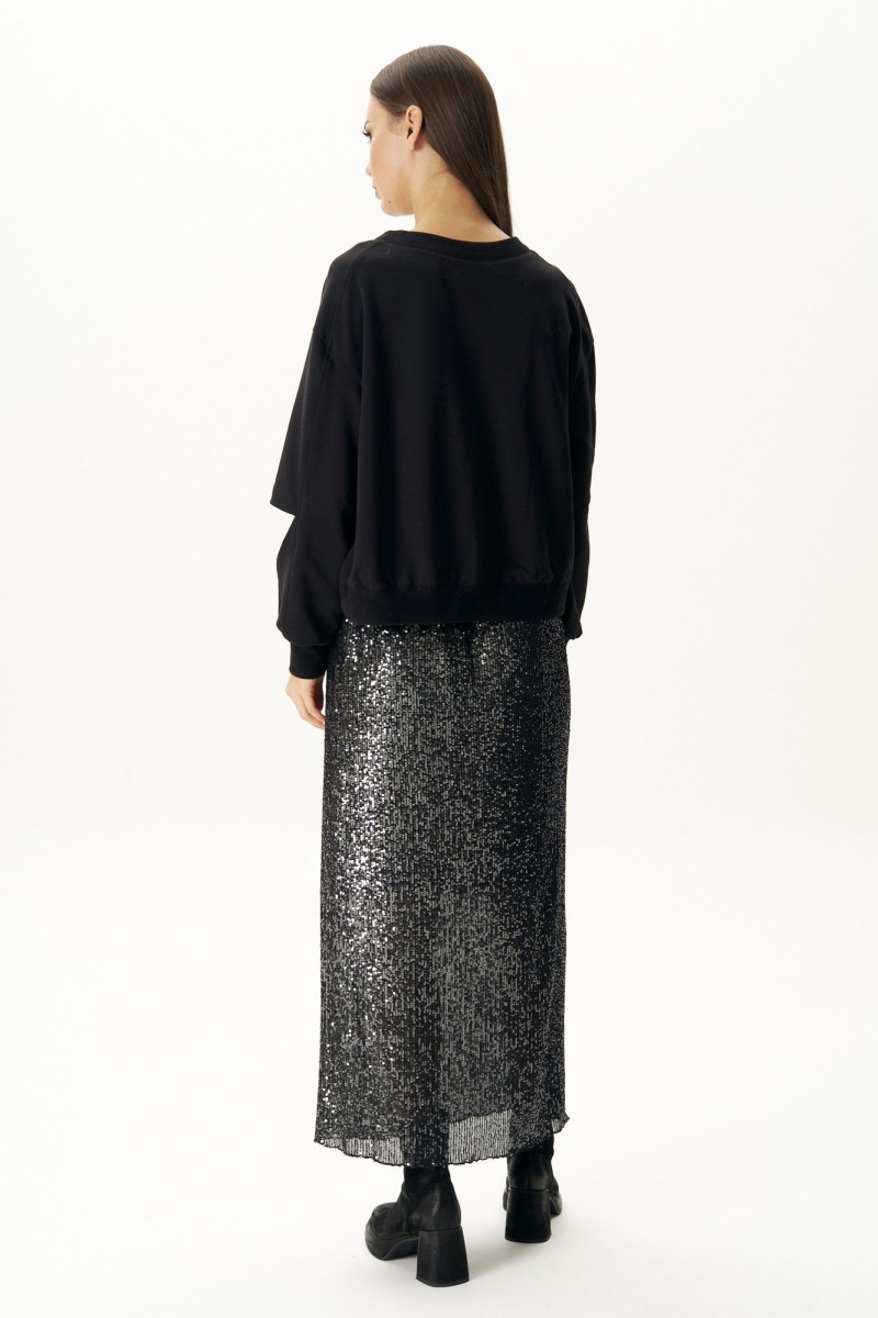 Тренд на металлический блеск в одежде триумфально ворвался в нашу жизнь, а вместе с ним - блестящие юбки макси длины. Чем не повод приобрести для себя такую юбку из трикотажной пайетки. Она, как нельзя лучше, подходит для создания стильного, нарядного образа, а если заменить свитшот, и дополнить спортивной обувью, то и для повседневного. Юбка прямая, длинная на эластичном поясе и подкладке. Свитшот свободного силуэта, с заниженной линией плеча, рукавом, расширенным в области оката, декоративным элементом по центру полочки. Рукав двухшовный с поперечным подрезом на передней части. Длина рукава с плечом около 74 см. Длина юбки около 90 см.