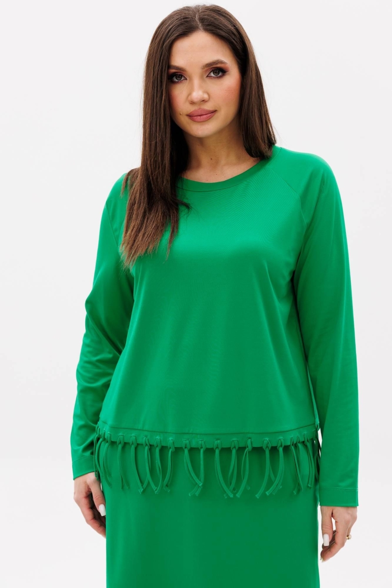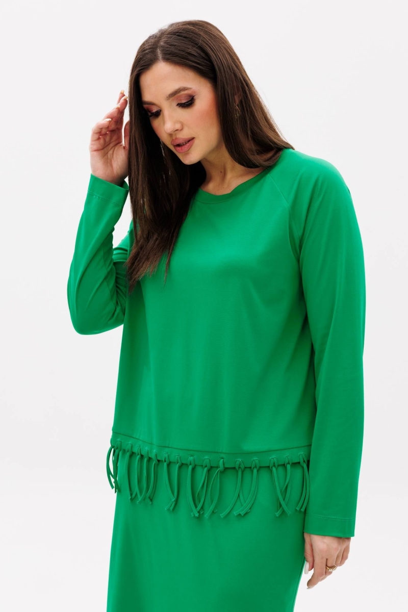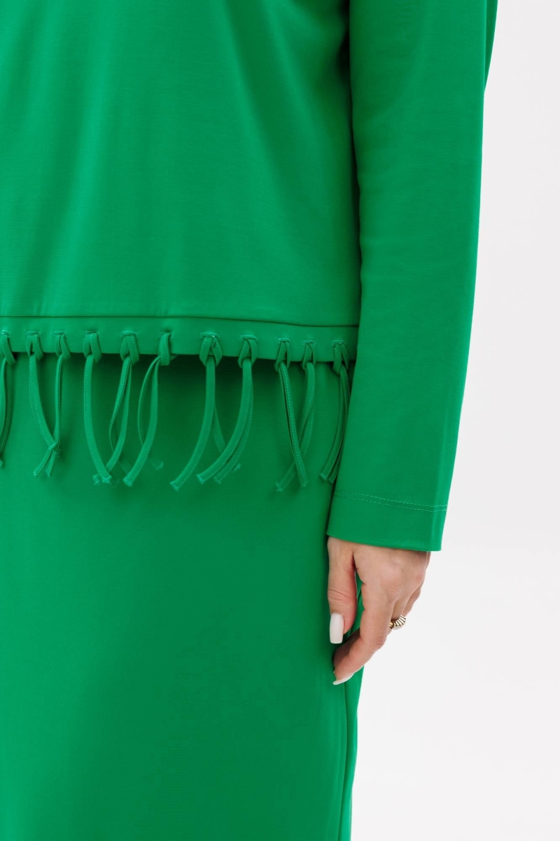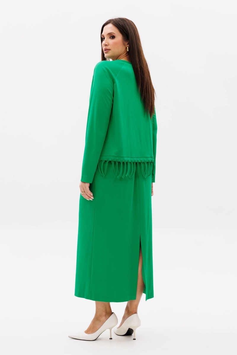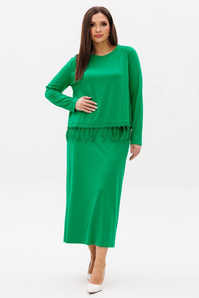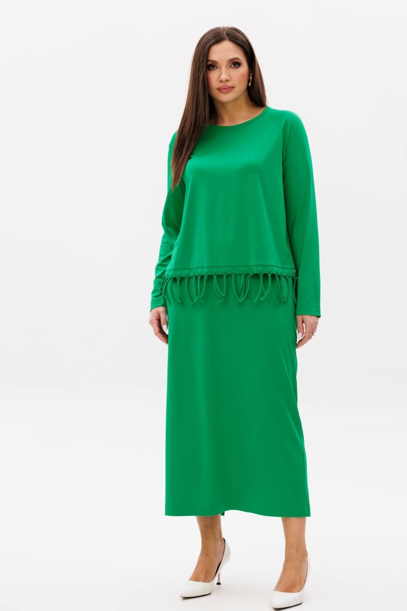 Если Вам нравится чувствовать себя свободно и непринуждённо, то трикотажный костюм с юбкой - Ваш идеальный выбор. Весна - время обновления, поэтому яркий цвет и игривая модель с бахромой на волне актуальности, она снижает градус обыденности и придаёт образу дух свободы. Свободная блуза А-силуэта, покроя реглан с круглым вырезом горловины. Низ изделия с отделочной полоской и бахромой. Юбка макси, на эластичном поясе, с наклонными боковыми карманами и шлицей по заднему полотнищу. Длина блузы около 52 см. Длина рукава с плечом около 74 см. Длина юбки около 80 см.