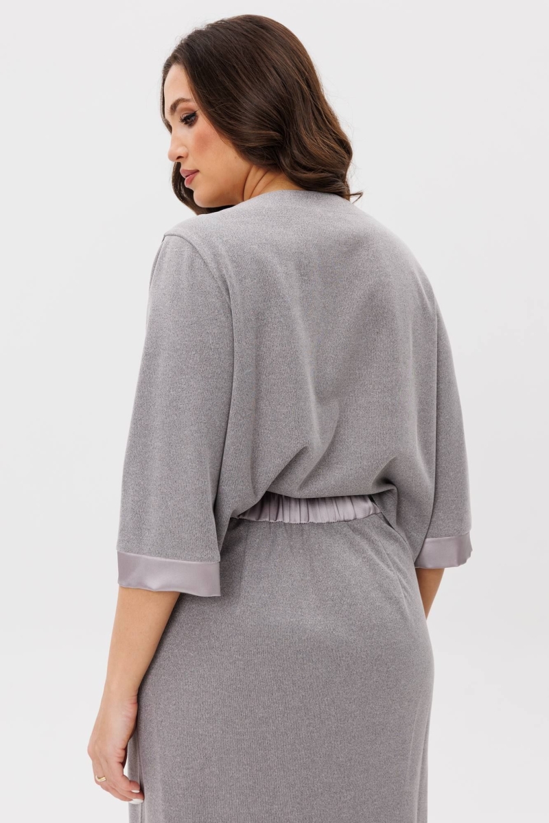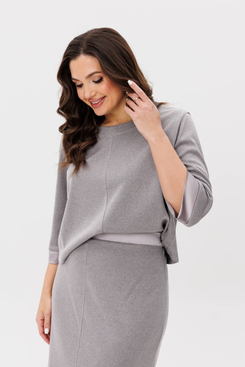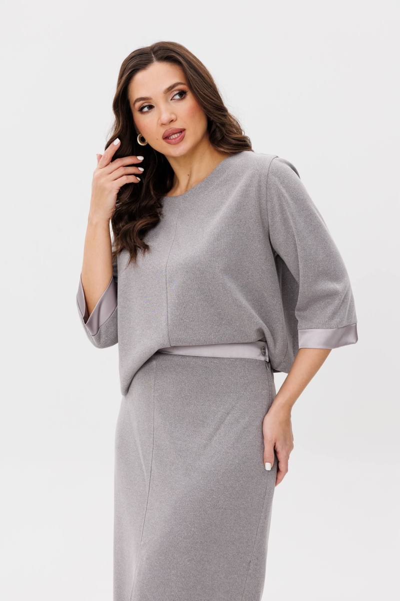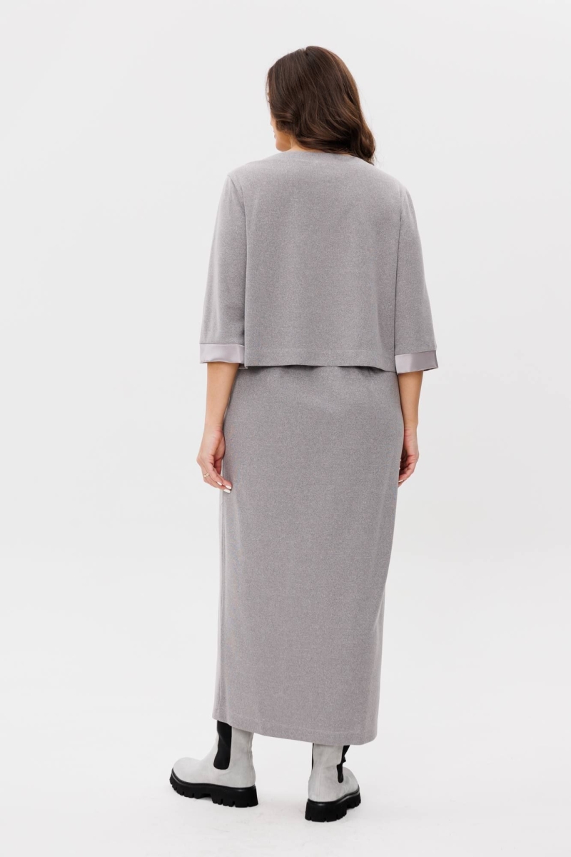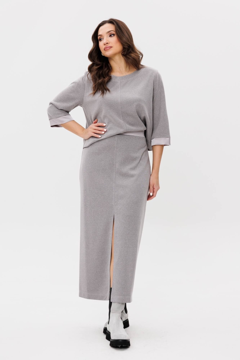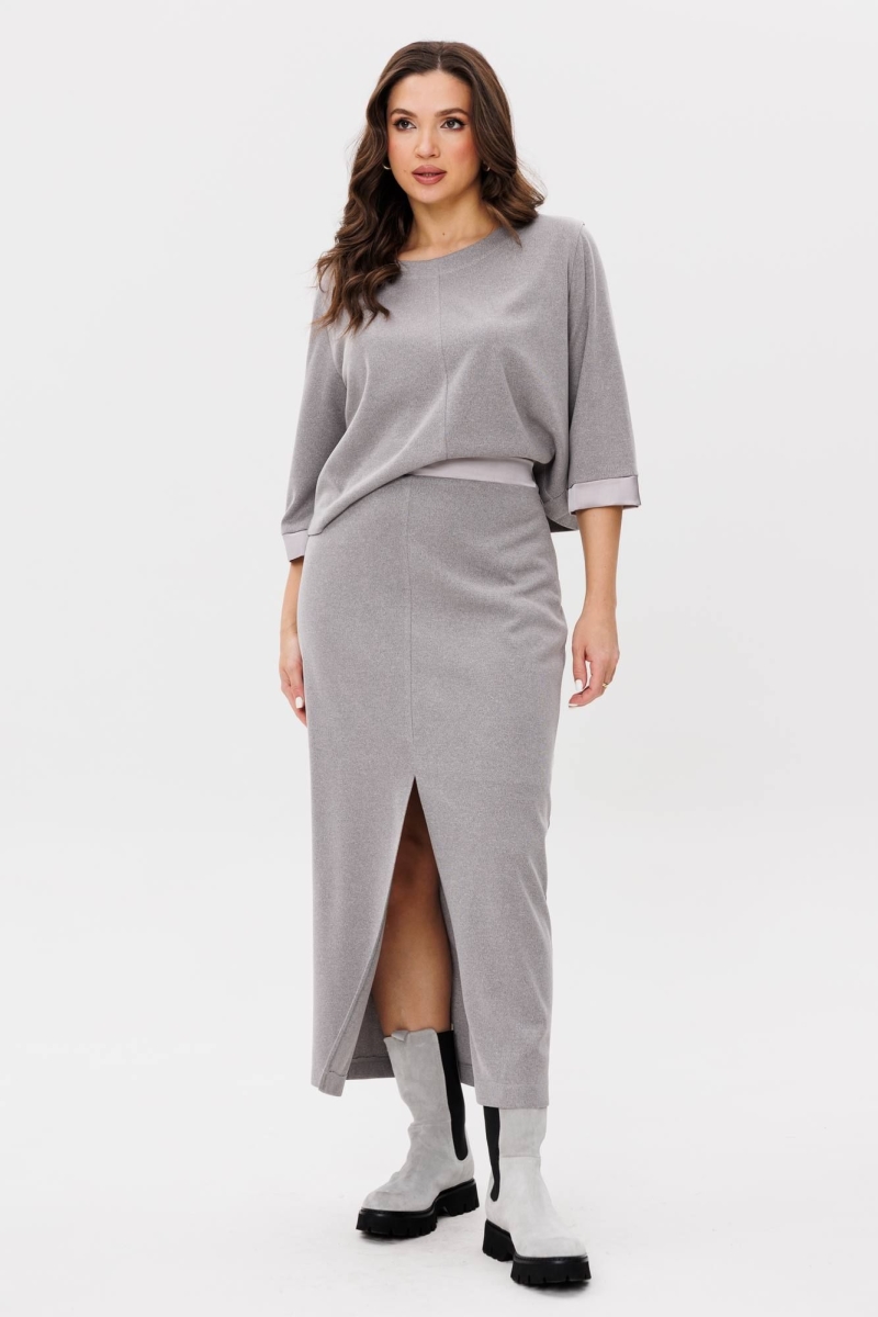 Костюм с юбкой - универсальный вариант для кокетливой модницы, предпочитающей элегантность в повседневном стиле. Свободный джемпер и юбка длины макси из комфортного вискозного трикотажного полотна с лёгким меланжевым эффектом. Джемпер втачного покроя с круглым вырезом горловины и рукавом 3/4. Юбка с притачным поясом, эластичным в области спинки, центральным швом и разрезом по переднему полотнищу. Особый шарм модели придают отделочные манжеты рукавов и пояс. Длина джемпера около 54 см (46-48 размер), около 58 см (50-52 размер). Длина рукава около 48 см. Длина юбки около 90 см.