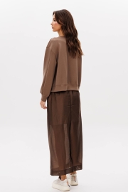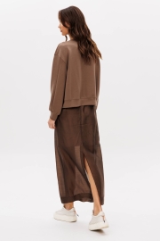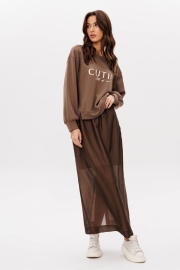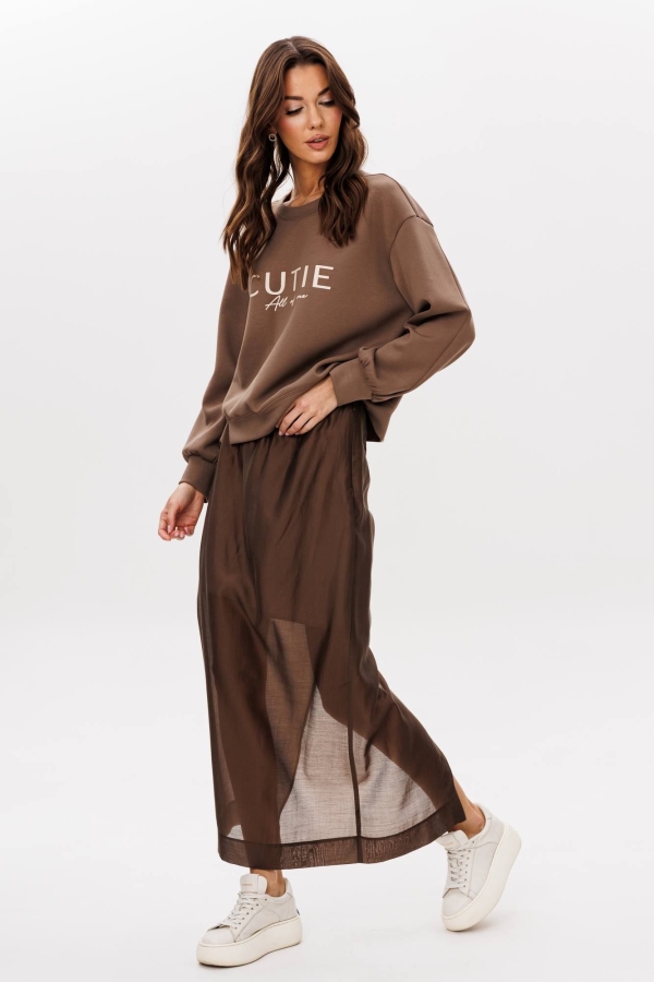 Базовый женский джемпер с круглой горловиной в сочетании с длинной элегантной юбкой - ещё один тренд этой осенью и зимой. Главный секрет, который сделает из юбочных комбинаций ультрамодные, скрывается в сочетании в одном образе вещей контрастных текстур. Такой монохромный look идеально подходит для создания нескучного аутфита. Прямая юбка длины макси на эластичном тонком поясе, с уютной трикотажной хлопковой подкладкой. Заднее полотнище юбки с центральным швом, талиевой вытачкой и высокой шлицей. Застёжка на потайную тесьму-молнию. Свитшот свободный, с заниженной линией плеча, манжетой по низкам рукавов и низу изделия и трендовым принтом. Длина юбки около 87 см. Длина свитшота около 60 см. Длина рукава с плечом около 74 см.