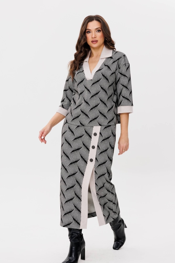 Модный трикотажный костюм с юбкой станет отличным выбором для повседневных образов. В нём удобно и комфортно! Свободный упрямлённый джемпер с вырезом поло, воротником и отделкой из контрастного трикотажного полотна. Юбка прямая. с эффектной шлицей по левой стороне переда и отделкой из контрастного полотна. Пояс юбки на эластичной тесьме в области спинки, с застёжкой по центру заднего полотнища. Длина джемпера в 46-48 р. около 60 см, в 50-52 р. около 63 см. Длина рукава с плечом около 58 см. Длина юбки около 90 см.